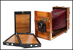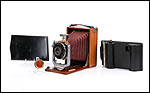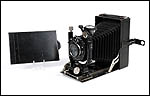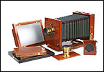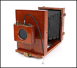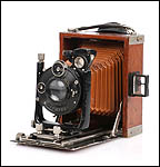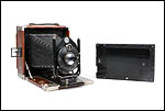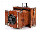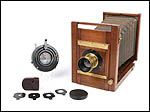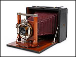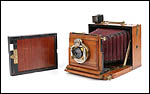 Cámara alemana de placas 10×15 cm, cuerpo tropical de teca, obturador Compur y objetivo Zeiss Tessar f/4.5 135 mm. Fabricada entre 1919 y 1922.