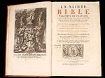 Gran Biblia en francés de la que se conservan dos volúmenes de tres. Encuadernación de época.