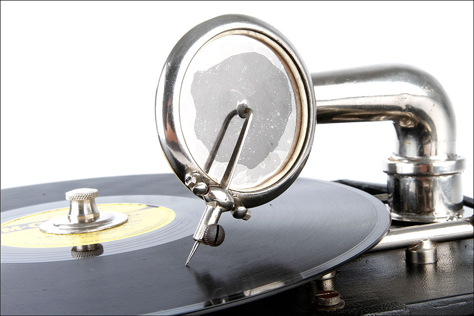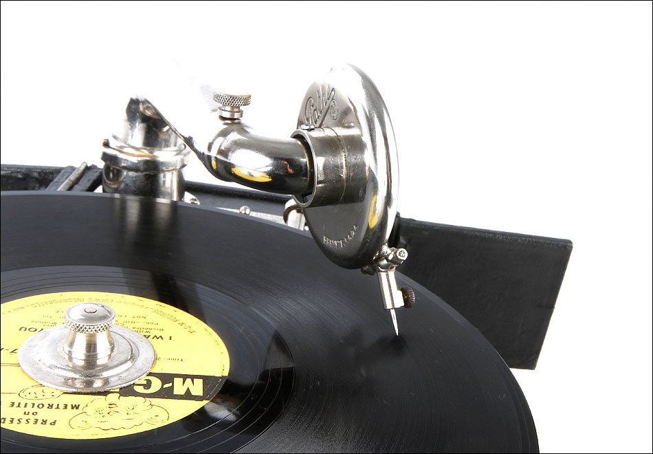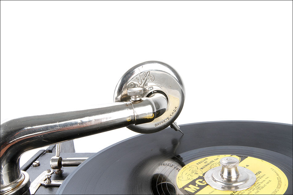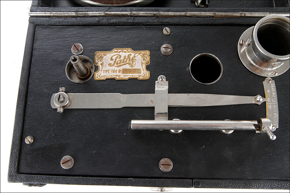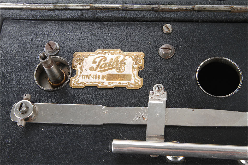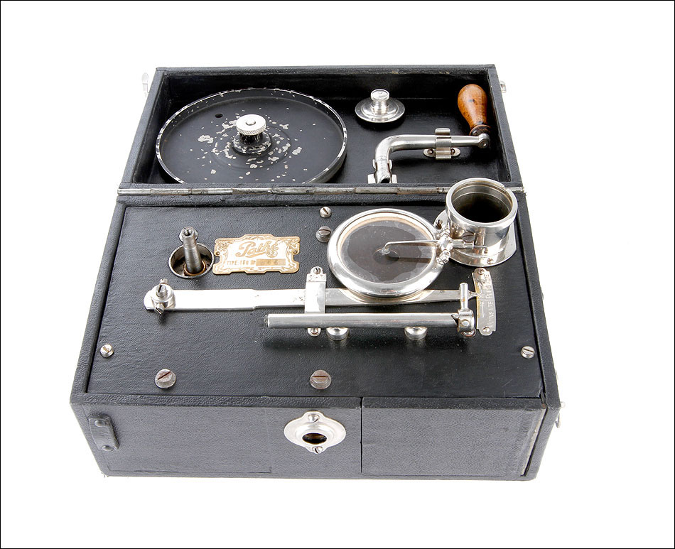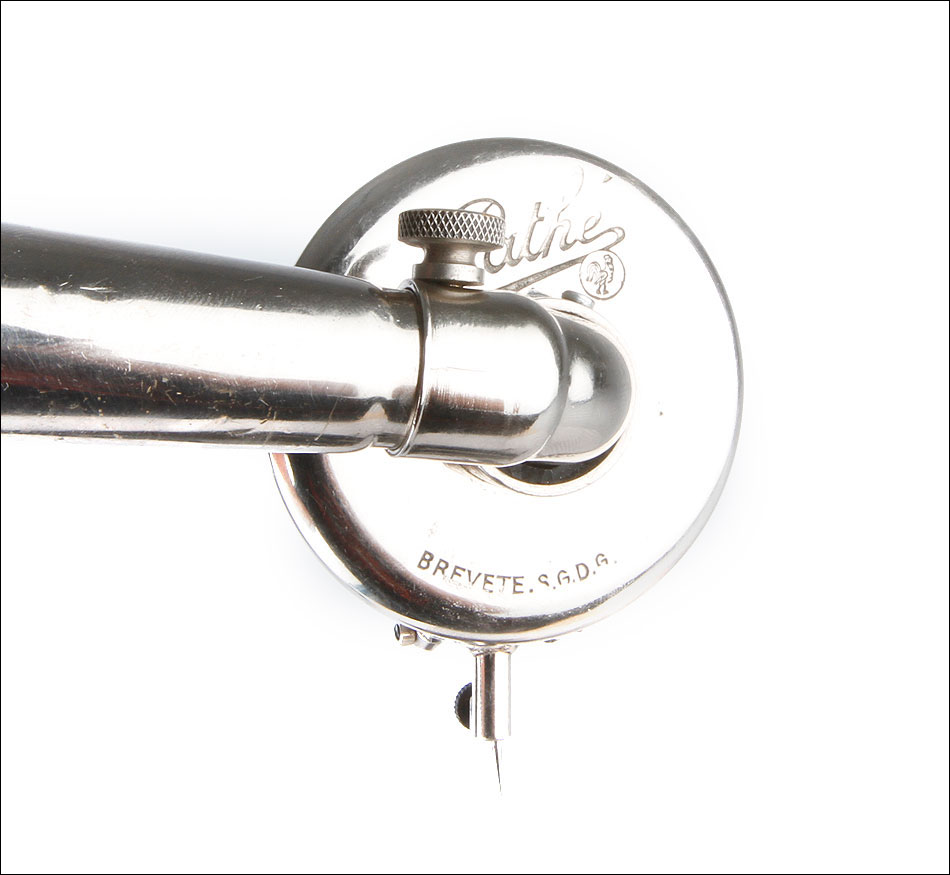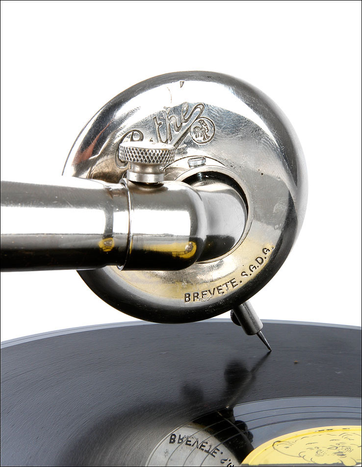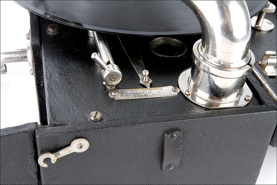 El gramófono lleva la firma Pathé grabada en el reproductor de metal. Junto a ella podemos ver un círculo con un gallo grabado en su interior, el logotipo de la marca. También lleva una placa con el modelo y el número de serie grabados: TYPE 180 Nº 366. La maleta de madera está revestida de piel negra lisa, brillante y uniforme, mientras que el resto de las piezas y componentes son de metal cromado. Llama la atención el magnífico estado en el que se encuentran, sin rastros de óxido y brillando como el primer día. El gramófono también conserva la manivela original que sirve para dar vida al motor, con empuñadura de madera de haya maciza color castaño dorado.