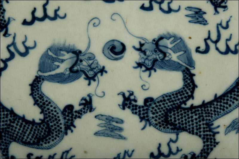 La decoración del plato nos muestra una pareja de elegantes dragones imperiales enfrentados. Los dragones son simétricos y fueron pintados a mano con gran detalle por un habilidoso artista. Sus alargados y sinuosos cuerpos, completamente decorados con pequeñas escamas, se estiran hacia la parte superior del plato cubriendo la blanca superficie. En la parte inferior distinguimos las caras de las bestias mitológicas, expresivas y decoradas con todo lujo de detalles. Como suele ser habitual en las piezas con representaciones de dragones, éstos están rodeados por nubes y por unas formas abstractas que recuerdan a llamas de fuego.