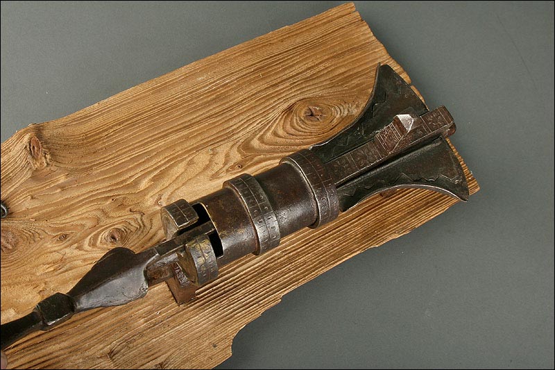 El mecanismo cuenta con un cuerpo central de forma cilíndrica, reforzado en sus extremos y su centro por tres anillos. Estos tres anillos están decorados con un sencillo motivo de cuadrículas y puntos, mientras que el cilindro es liso y no presenta decoración alguna. En el extremo derecho del cilindro aparece insertada una pieza móvil, con forma de corazón y terminada en un vástago que se introduce en la anilla de la cadena, que a su vez va clavada al soporte de madera. Esta pieza móvil tiene en su centro una forma cuadrada delicadamente grabada con pequeñas curvas y puntos. El otro extremo es más llamativo, estando formado por un eje central decorado con flores grabadas y dos alas triangulares simétricas adornadas con un motivo de zigzag.