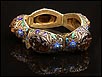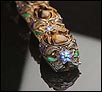 Si contemplamos de cerca la pulsera, podremos distinguir en cada una de sus piezas los delicados diseños repujados en la plata, con forma de flores, hojas y volutas. El diseño es el mismo en todas las piezas, y está embellecido con brillantes esmaltes en color azul, turquesa y verde. Los esmaltes están perfectamente conservados, al igual que las uniones entre las piezas. Destacando por encima del resto de la decoración, los cinco ojos de tigre que adornan la pulsera muestran su hermosa talla realizada a mano, también representando motivos florales. Cada talla es distinta de las demás, lo que confiere a la pulsera un atractivo muy especial.