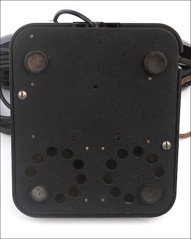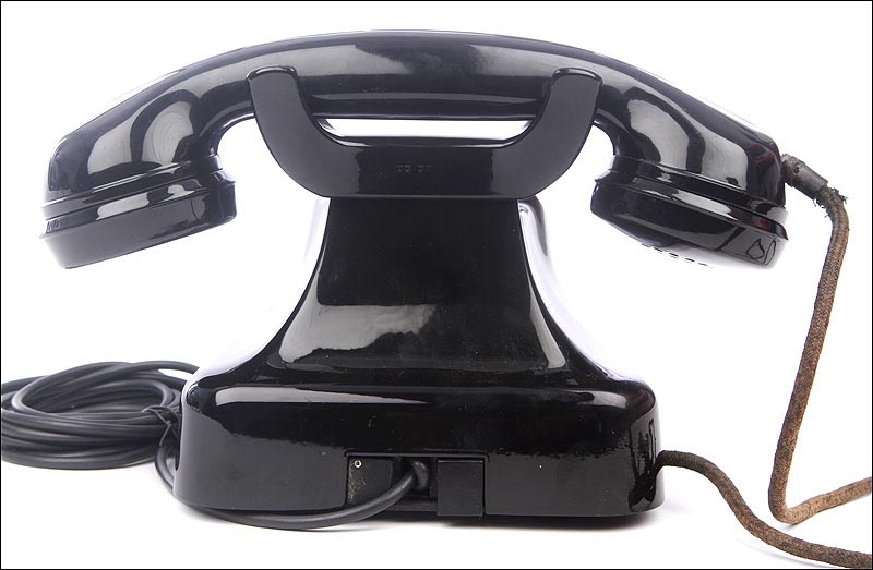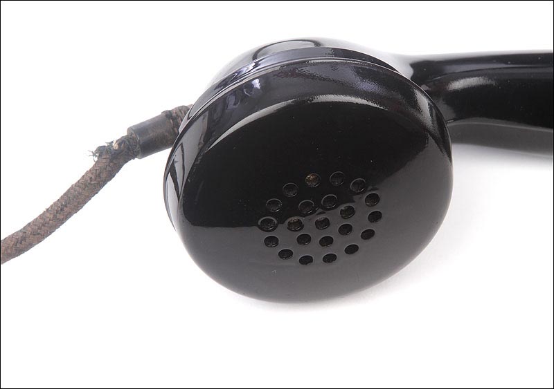 Este teléfono es una pieza original de mediados del siglo XX y en ningún modo una reproducción actual. La baquelita negra con la que está fabricado se encuentra en muy buenas condiciones, lisa y brillante y sin desperfectos ni arañazos. Al teléfono no le falta ninguna pieza, conservando además el cable original revestido de tela que comunica el auricular-micrófono con el resto del aparato. El revestimiento del cable está muy ligeramente deshilachado en su conexión con el micrófono, pero aún así funciona a la perfección. El disco de marcar es también de color negro, estando las cifras impresas en blanco tanto en la superficie bajo los agujeros como en la propia rueda, en tamaño más pequeño.