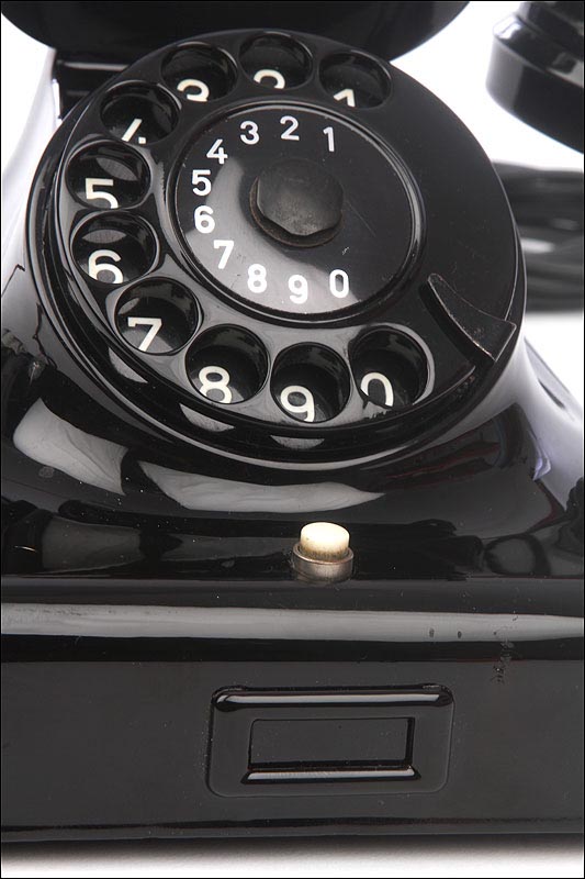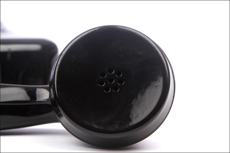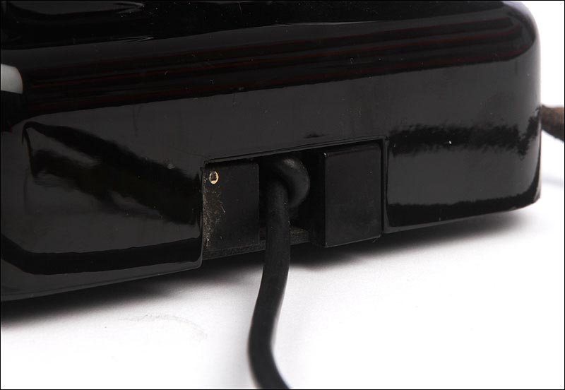 Bajo la rueda, en la parte frontal distinguimos también un llamativo botón cilíndrico de baquelita blanca que muy probablemente estaba destinado a contactar directamente con la operadora del servicio telefónico. Este tipo de teléfonos de baquelita negra fueron enormemente populares a mediados del siglo pasado, siendo protagonistas de excepción de muchas películas de cine negro norteamericano. En concreto, este teléfono es un auténtico superviviente de aquellos años que todavía hoy puede destacar con su bella presencia e inigualable encanto en la casa más especial.