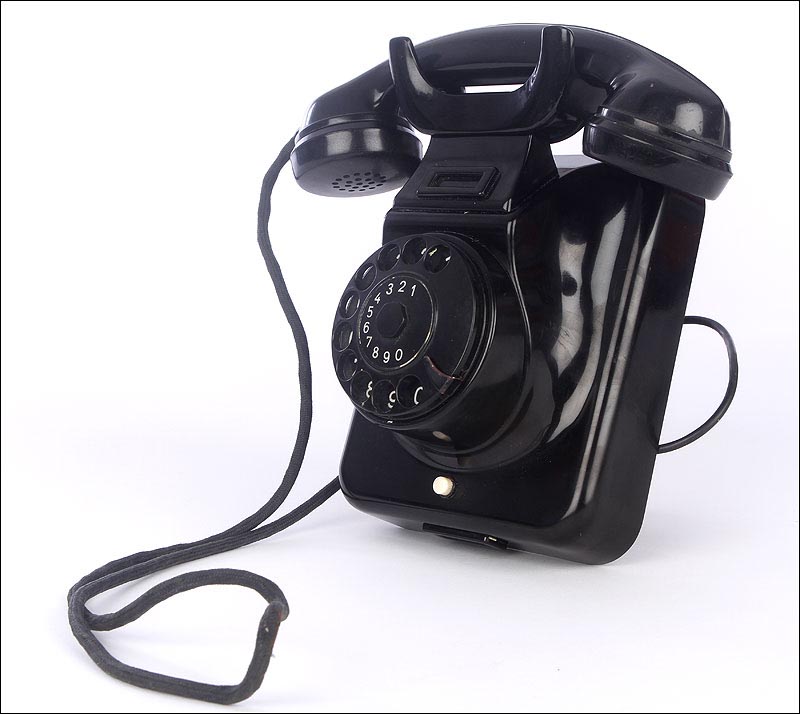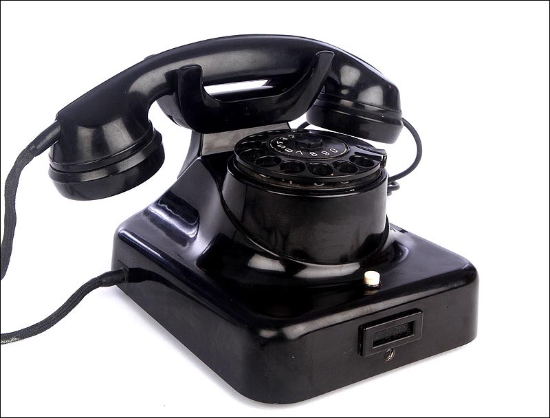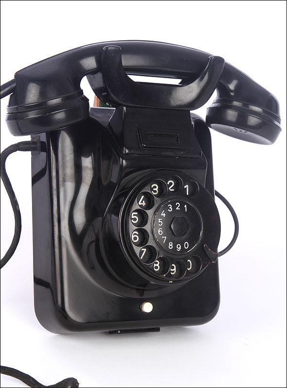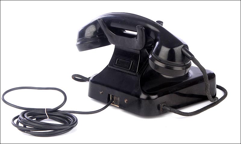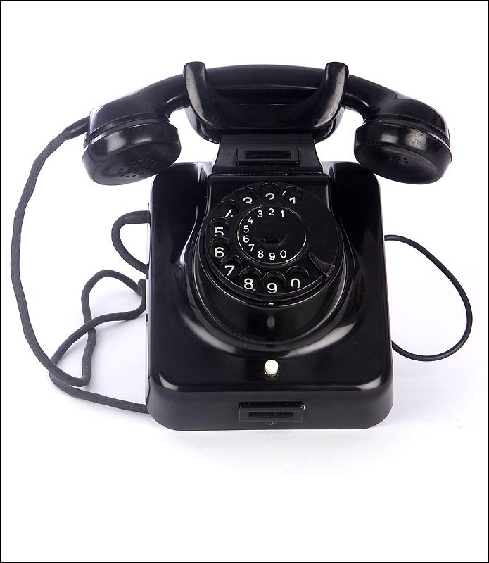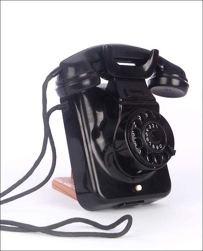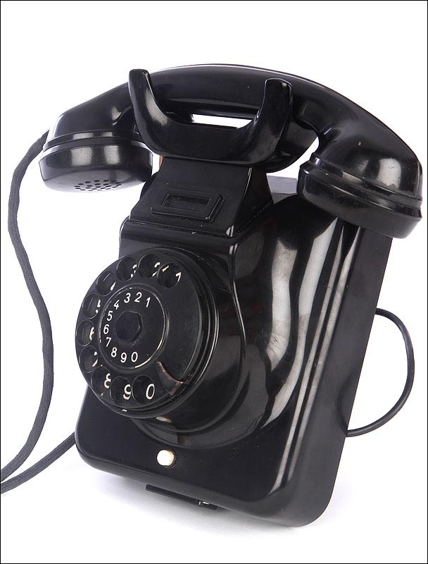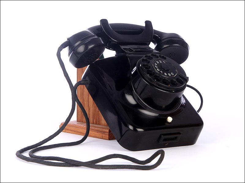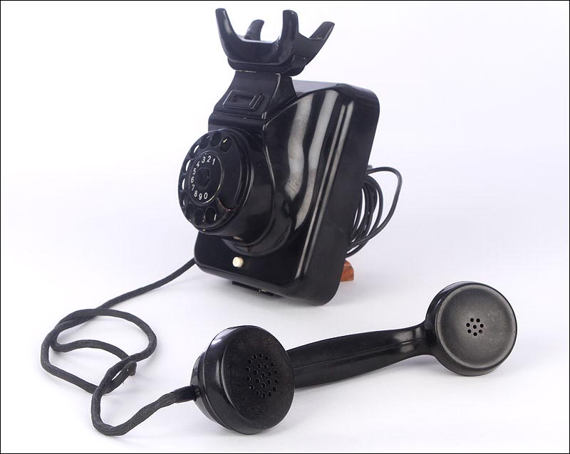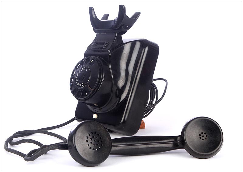 Teléfono alemán de los años 40 fabricado en baquelita negra, muy bien conservado y funcionando a la perfección. Este curioso teléfono es una pieza muy especial, ya que se trata de un modelo convertible que puede colocarse indistintamente sobre una superficie horizontal, o colgarse en una pared vertical. El ingenioso sistema para cambiar el tipo de teléfono es muy simple: basta con cambiar de orientación la horquilla donde se apoya la pieza con el auricular y el micrófono, y que también sirve para "colgar" una llamada. Dependiendo de cómo esté colocada la horquilla, el teléfono podrá colocarse de una u otra manera. Además de este curioso sistema, este artículo también tiene gran interés al tratarse de un modelo original de la época en muy buen estado de conservación.