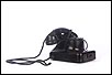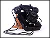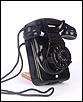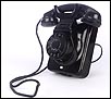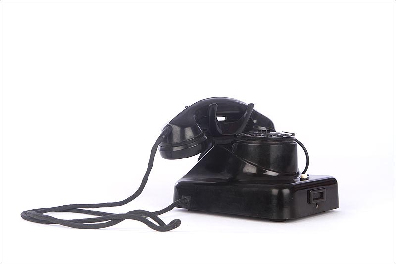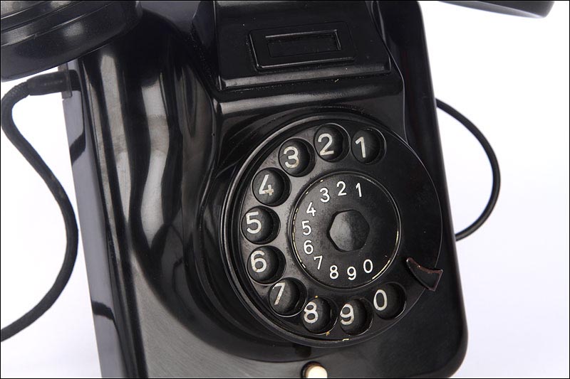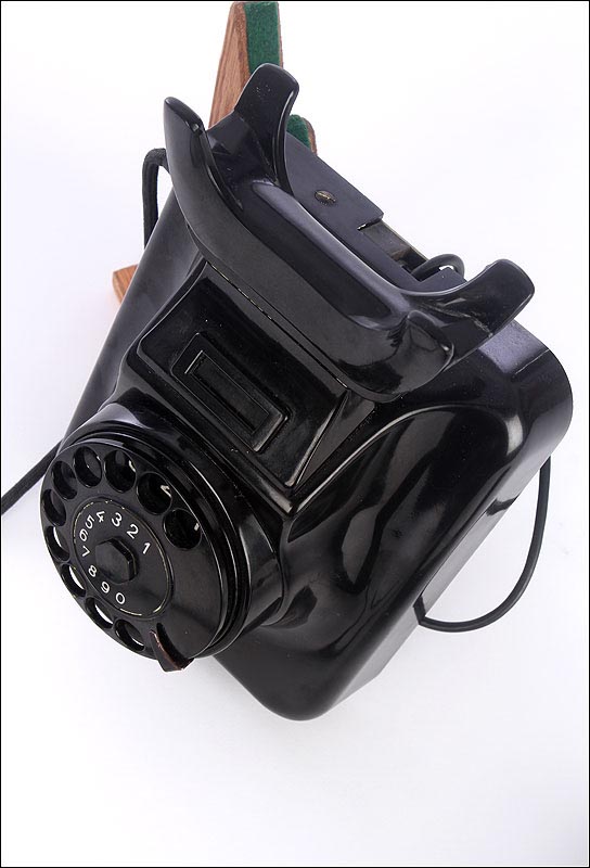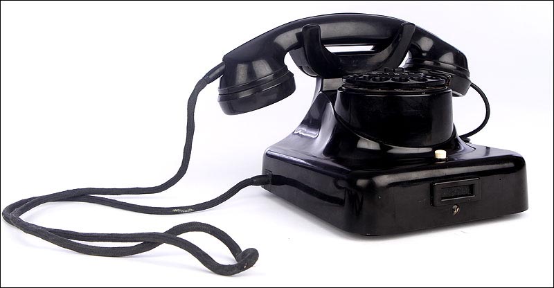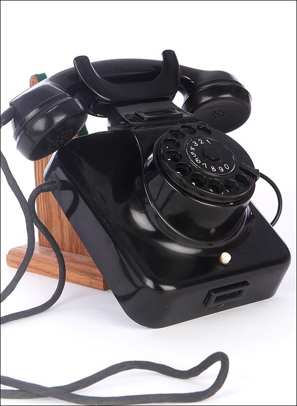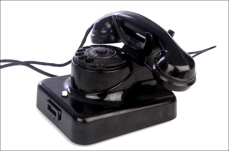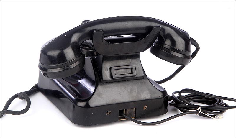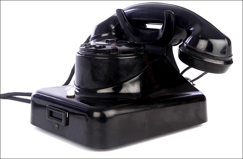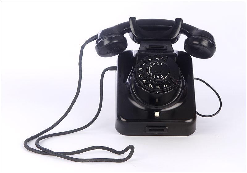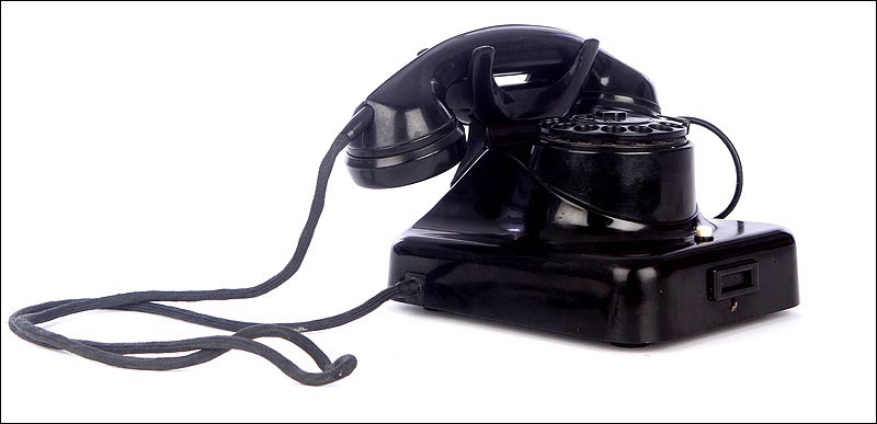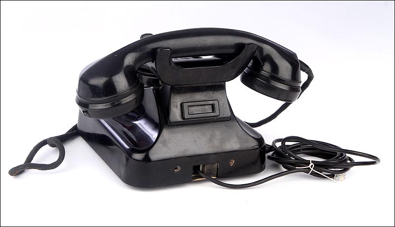 Teléfono alemán de los años 40 fabricado en baquelita negra, muy bien conservado y funcionando a la perfección. Este curioso teléfono es una pieza muy especial, ya que se trata de un modelo convertible que puede colocarse indistintamente sobre una superficie horizontal, o colgarse en una pared vertical. El ingenioso sistema para cambiar el tipo de teléfono es muy simple: basta con cambiar de orientación la horquilla donde se apoya la pieza con el auricular y el micrófono, y que también sirve para "colgar" una llamada. Dependiendo de cómo esté colocada la horquilla, el teléfono podrá colocarse de una u otra manera. Además de este curioso sistema, este artículo también tiene gran interés al tratarse de un modelo original de la época en muy buen estado de conservación.