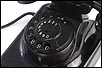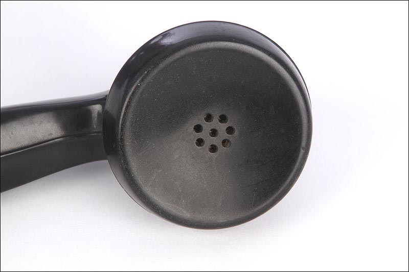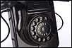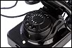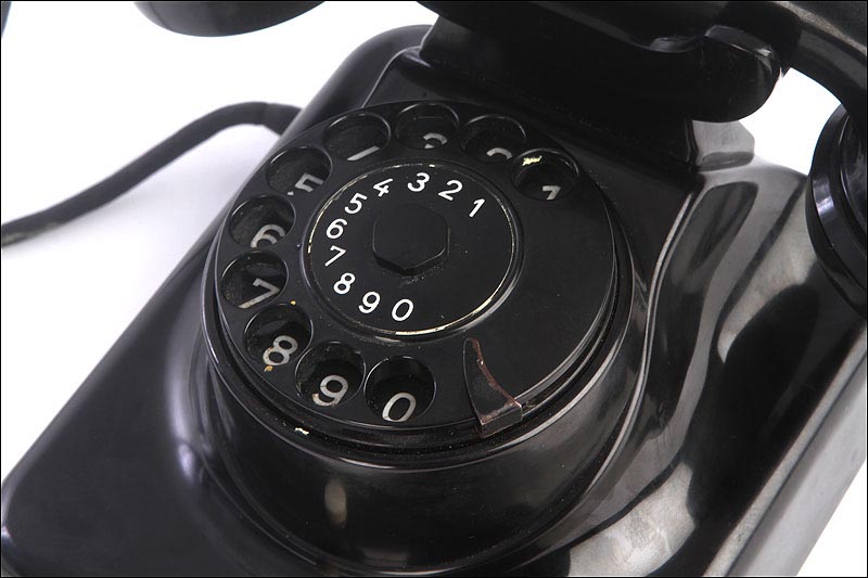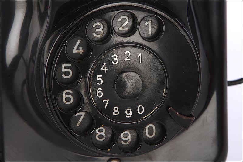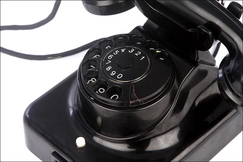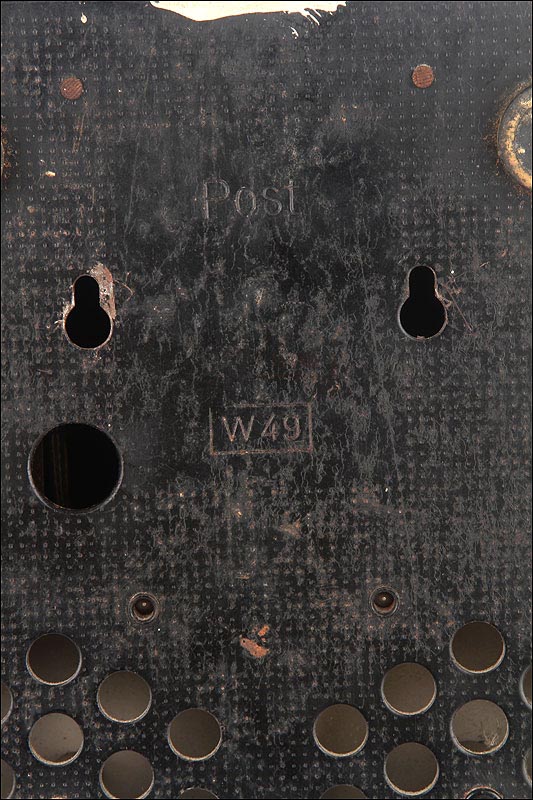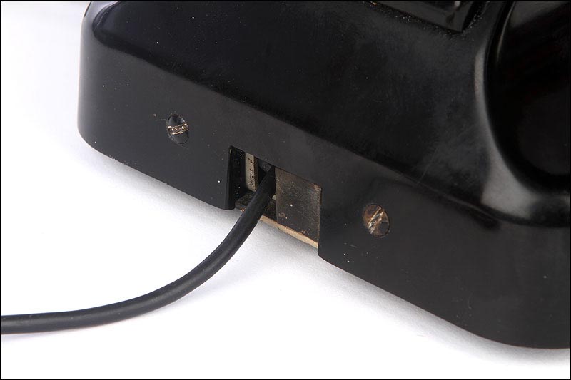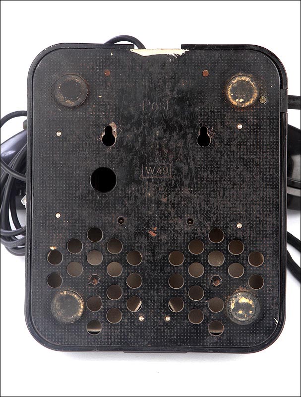El disco de marcaje, situado en la parte frontal del aparato es también negro, y funciona con fluidez y suavidad. A través de sus aberturas podemos ver los finos números impresos en color blanco sobre el material negro. Los números aparecen de nuevo, aunque más pequeños, impresos sobre el propio disco. Un poco más abajo podemos ver un pequeño botón de color blanco que en origen servía para que el usuario pudiese contactar directamente con la operadora de la línea telefónica. Si damos la vuelta al aparato, en la placa metálica que le sirve de base y protege el mecanismo vemos grabado el modelo: W 49, así como la palabra POST.