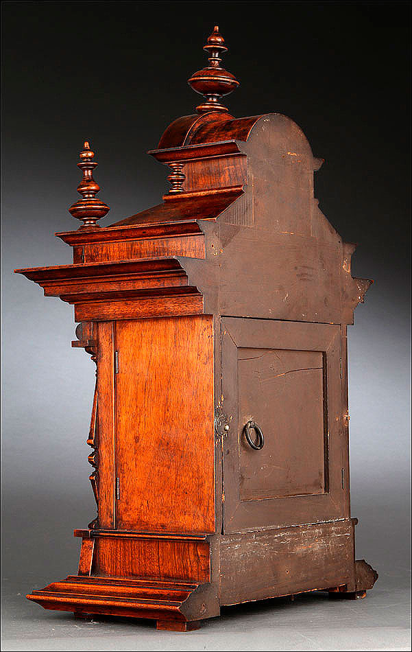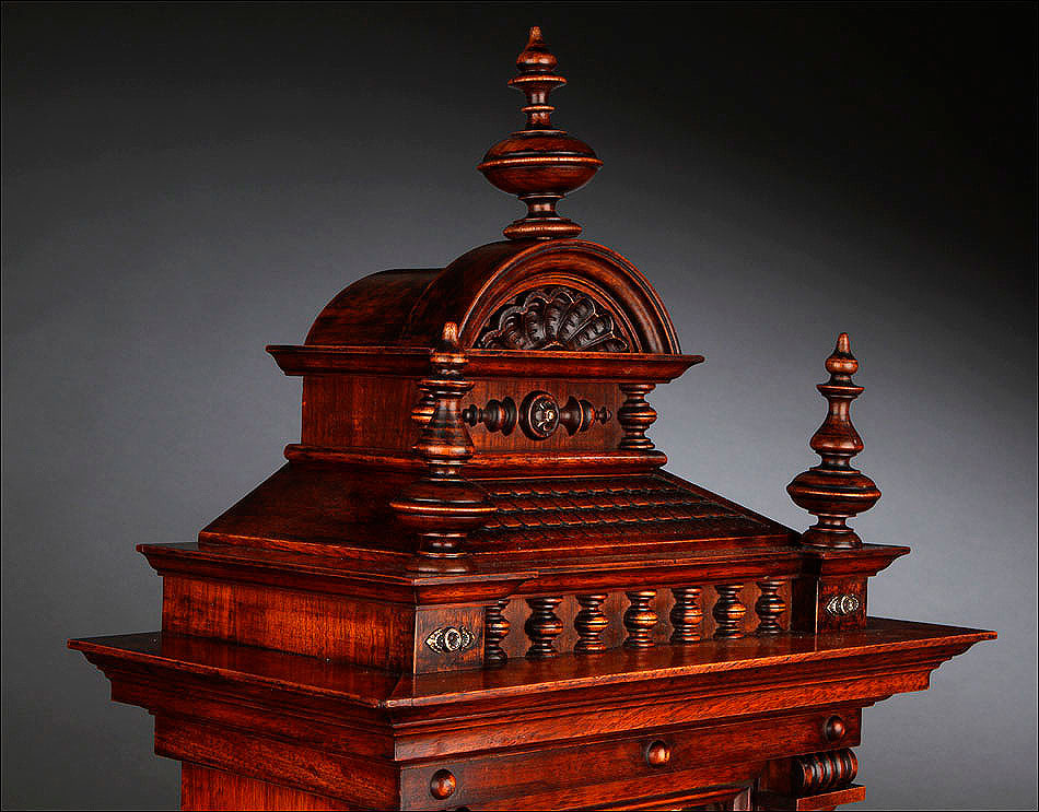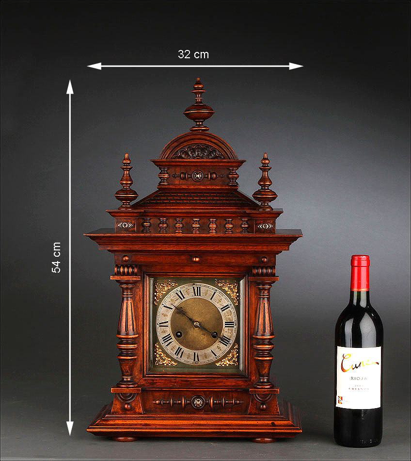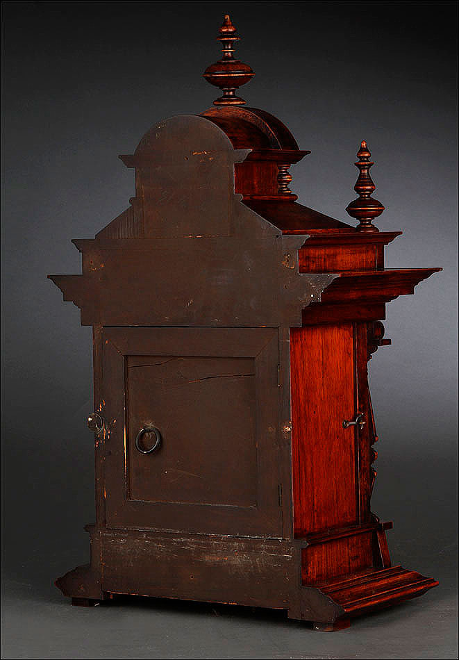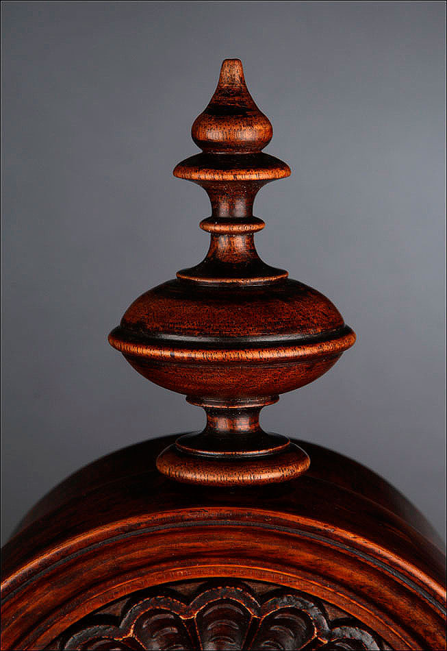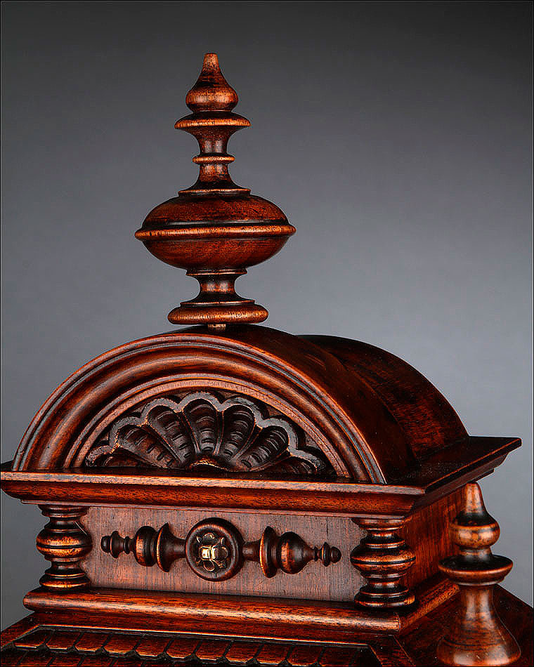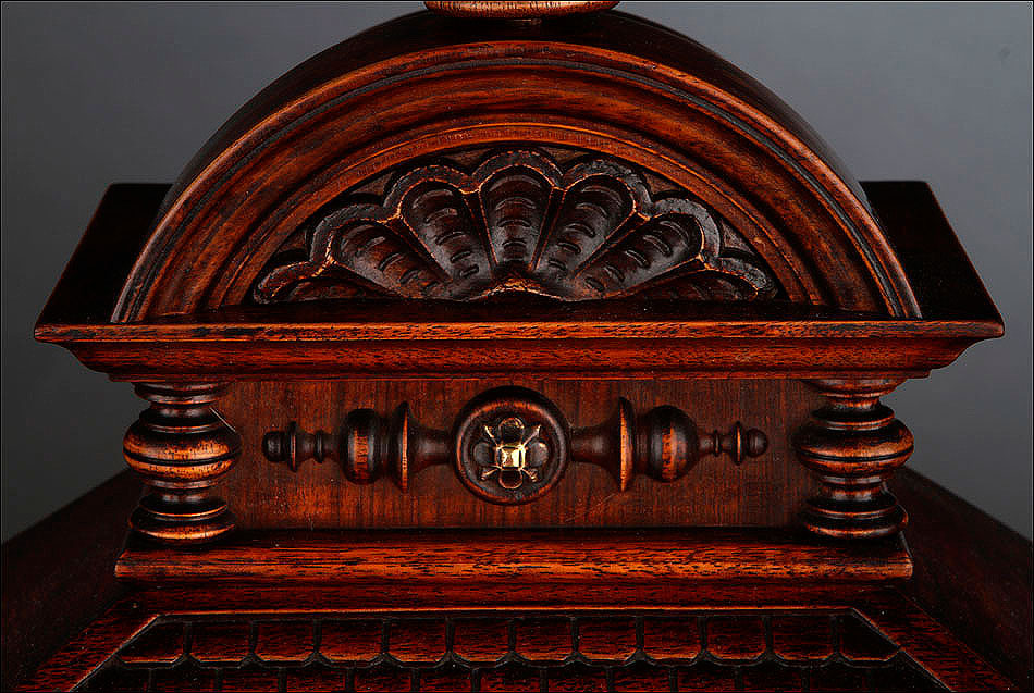 La caja de madera maciza está coronada por un remate con tres pináculos finamente torneados. La parte superior del reloj es especialmente bella, encontrándose profusamente tallada en un diseño de inspiración arquitectónica. La esfera está protegida por una puerta con cristal biselado, original de la época. A ambos lados, dos sobrias columnas torneadas aportan al conjunto una equilibrada belleza. El reloj se alza sobre una base moldurada provista de cuatro pequeñas patas. En el frontal, tres pequeños detalles de latón adornan la parte superior y el centro de la base, aportando luz y brillo al sobrio diseño de la caja. El reloj muestra un acabado impecable, cálido y con un brillo satinado que realza el color de la madera.