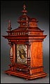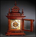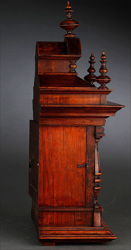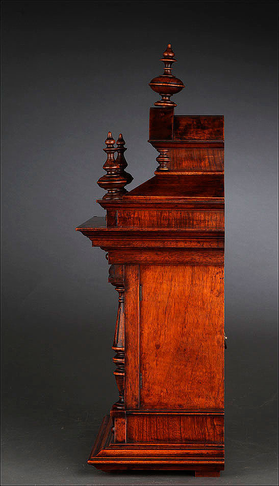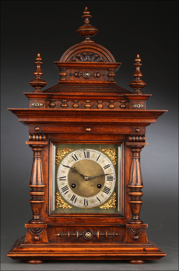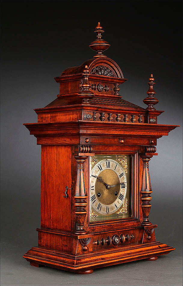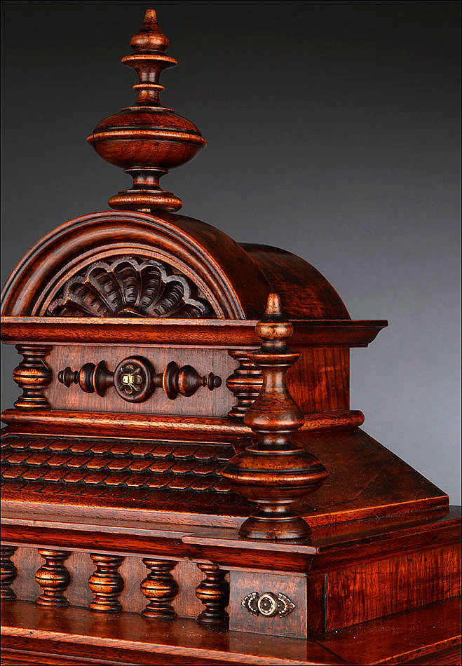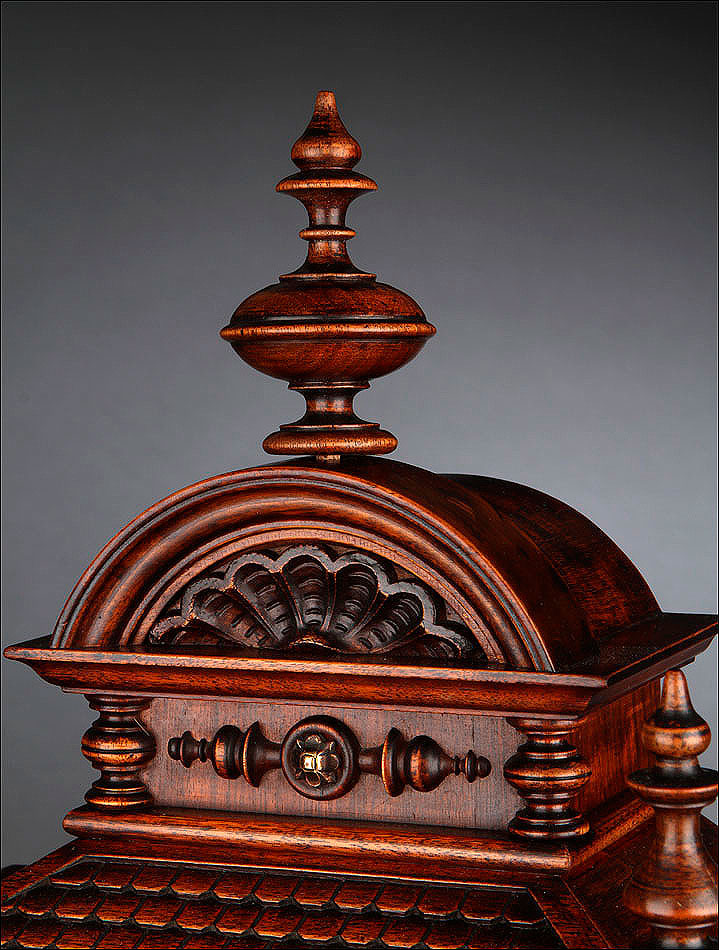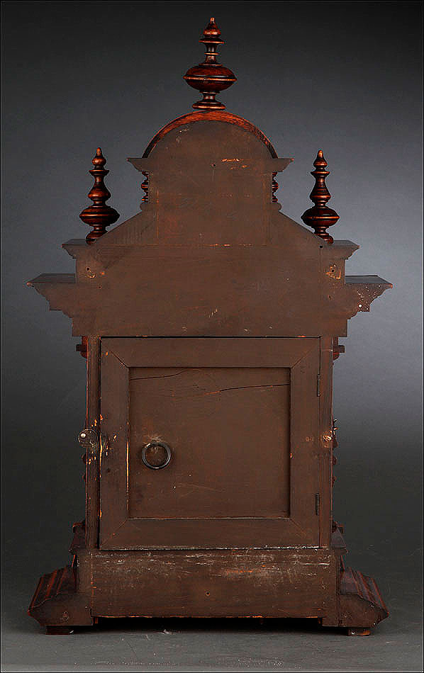 La caja de madera maciza está coronada por un remate con tres pináculos finamente torneados. La parte superior del reloj es especialmente bella, encontrándose profusamente tallada en un diseño de inspiración arquitectónica. La esfera está protegida por una puerta con cristal biselado, original de la época. A ambos lados, dos sobrias columnas torneadas aportan al conjunto una equilibrada belleza. El reloj se alza sobre una base moldurada provista de cuatro pequeñas patas. En el frontal, tres pequeños detalles de latón adornan la parte superior y el centro de la base, aportando luz y brillo al sobrio diseño de la caja. El reloj muestra un acabado impecable, cálido y con un brillo satinado que realza el color de la madera.