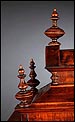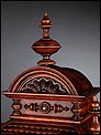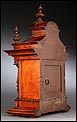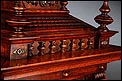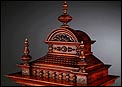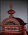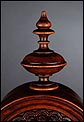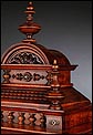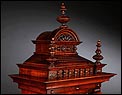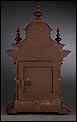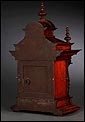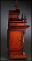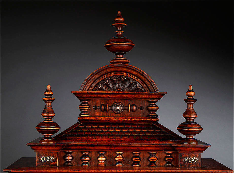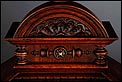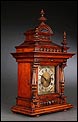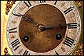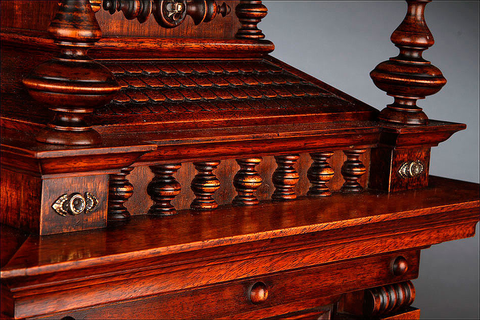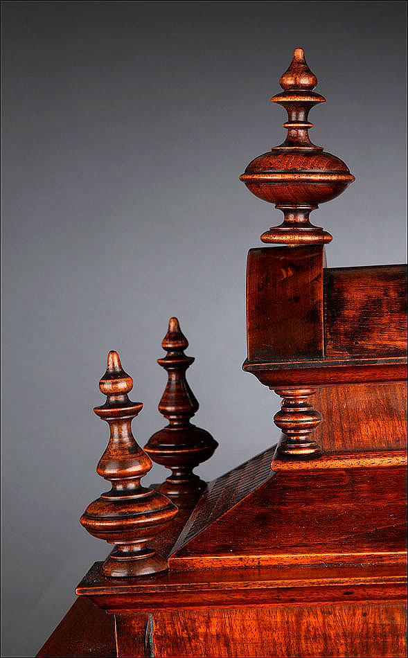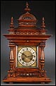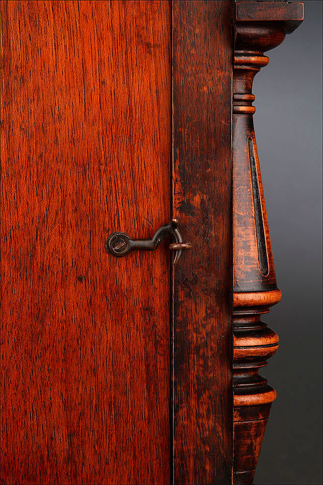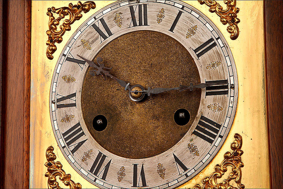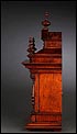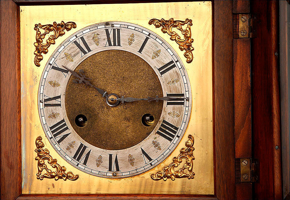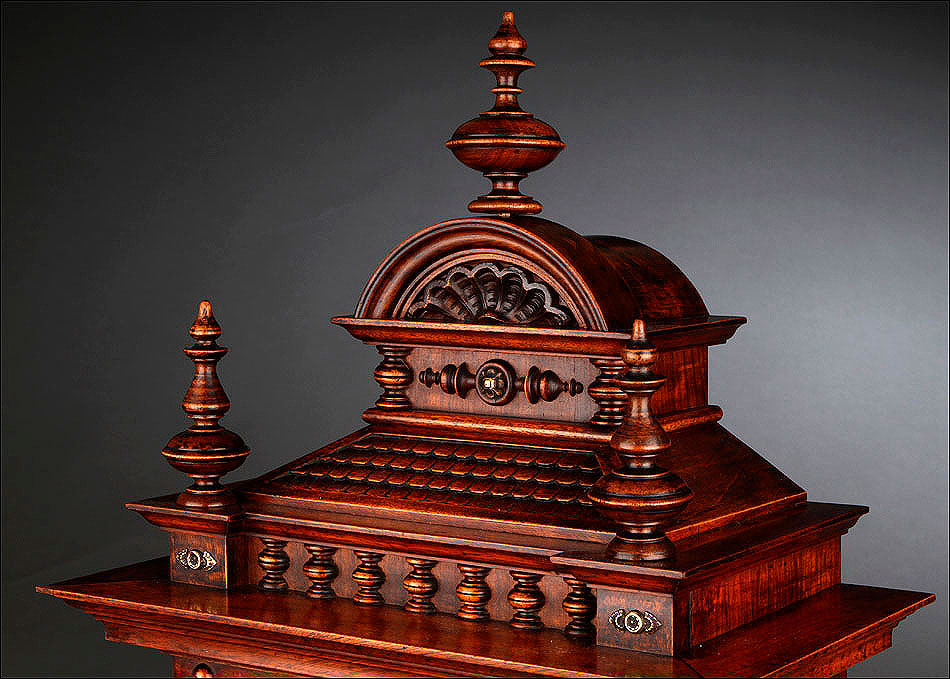 La caja de madera maciza está coronada por un remate con tres pináculos finamente torneados. La parte superior del reloj es especialmente bella, encontrándose profusamente tallada en un diseño de inspiración arquitectónica. La esfera está protegida por una puerta con cristal biselado, original de la época. A ambos lados, dos sobrias columnas torneadas aportan al conjunto una equilibrada belleza. El reloj se alza sobre una base moldurada provista de cuatro pequeñas patas. En el frontal, tres pequeños detalles de latón adornan la parte superior y el centro de la base, aportando luz y brillo al sobrio diseño de la caja. El reloj muestra un acabado impecable, cálido y con un brillo satinado que realza el color de la madera.