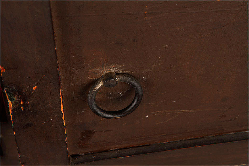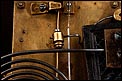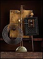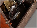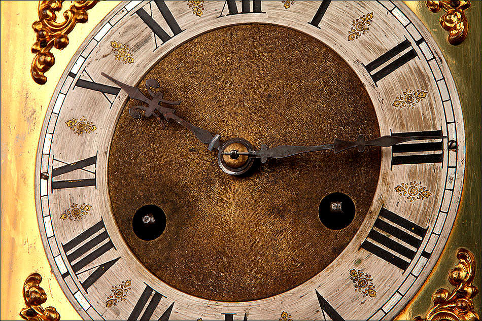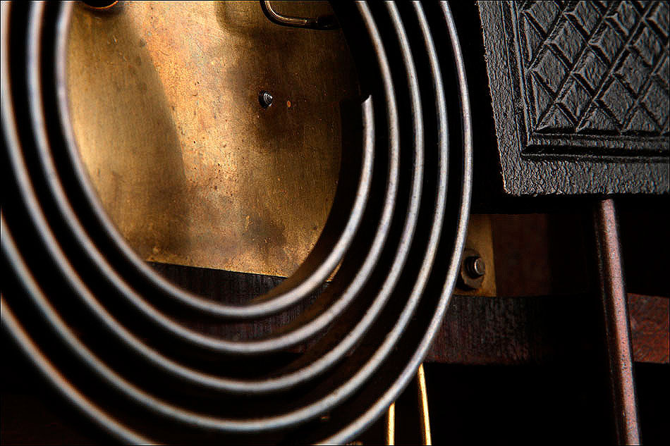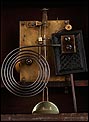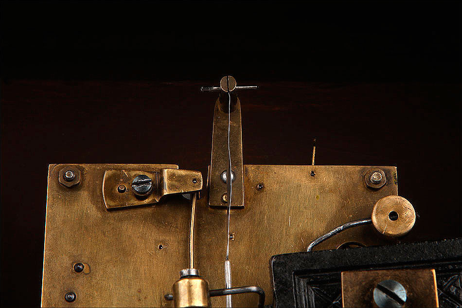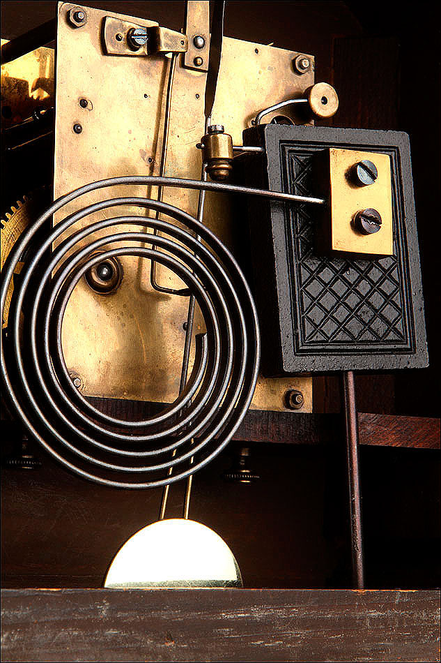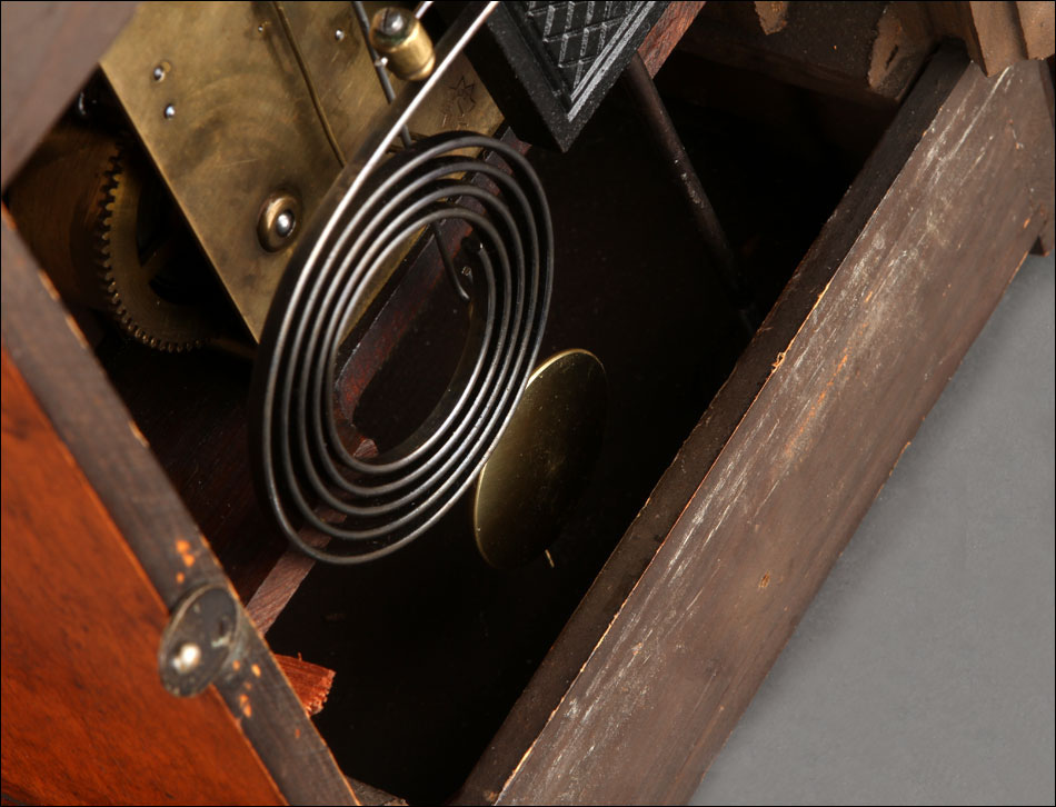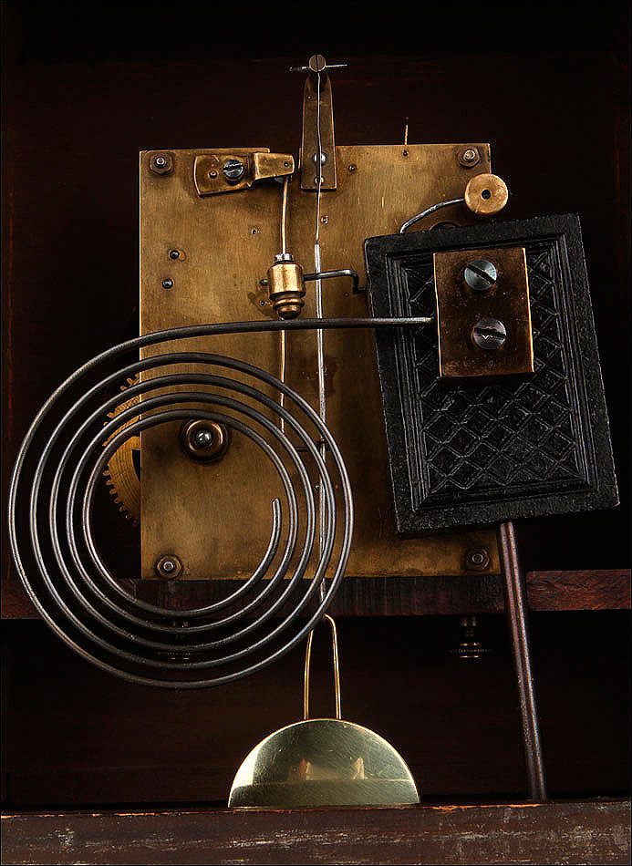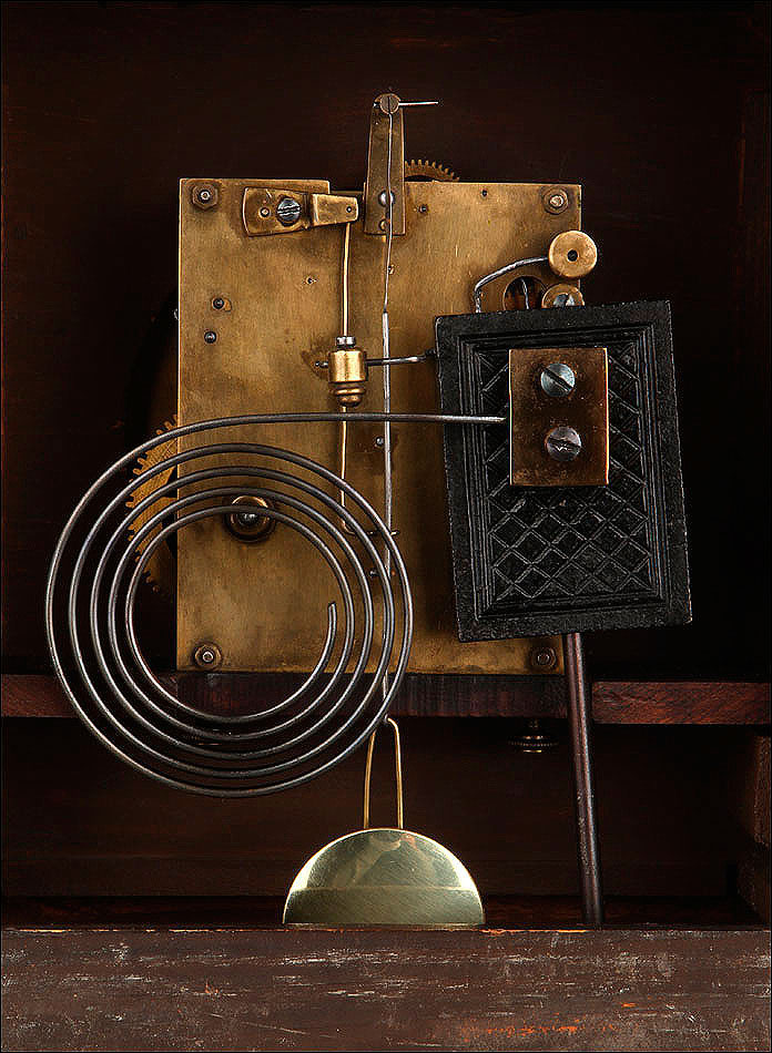 En la parte posterior de la caja encontramos una puerta con una argolla de metal, que se puede abrir para acceder al mecanismo que da vida al reloj. Se encuentra en perfecto estado de funcionamiento, conservando el péndulo y las piezas y engranajes originales. En la parte delantera también es posible abrir la puerta de cristal para acceder a la elegante esfera, de metal y con números romanos de color negro. En este punto se encuentran los dispositivos en los cuales hay que insertar la llave correspondiente para dar cuerda y poner en hora el reloj.