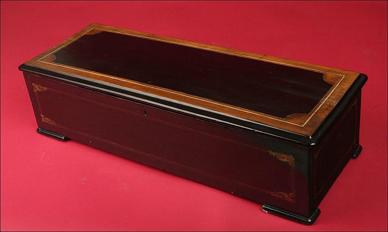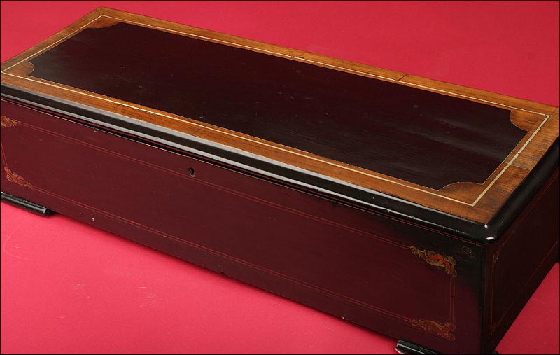 Enorme caja de música de madera con más de cien años de antigüedad, fabricada en Suiza a finales del s. XIX (1880-90). Esta caja mide setenta centímetros de longitud y es por ello una pieza muy rara, de gran belleza y exclusividad. La caja es de forma recta y sobria, alargada y con una tapa superior que deja al descubierto el mecanismo que reproduce las melodías. Dicho mecanismo va protegido por otra tapa con sobre de cristal. Toda la pieza está lacada en un profundo color negro y su acabado está muy bien conservado. Va adornada en distintos puntos con finos detalles en colores rojo y verde: filos que enmarcan las distintas caras y pequeños motivos florales en las esquinas.