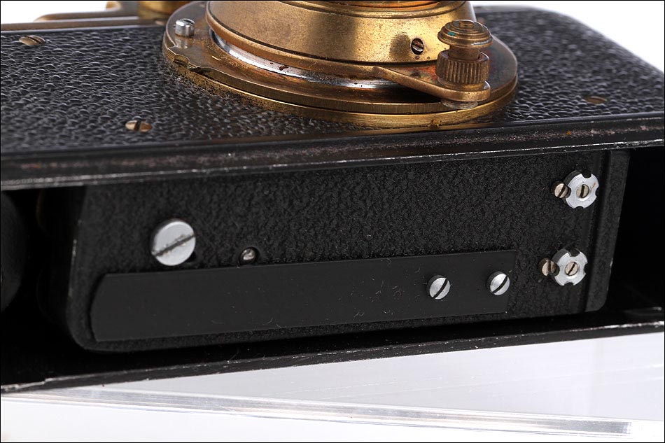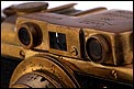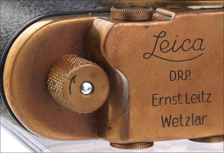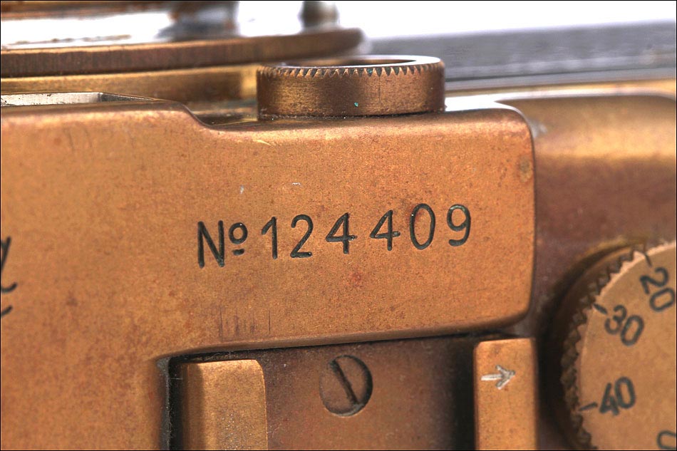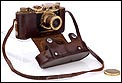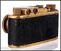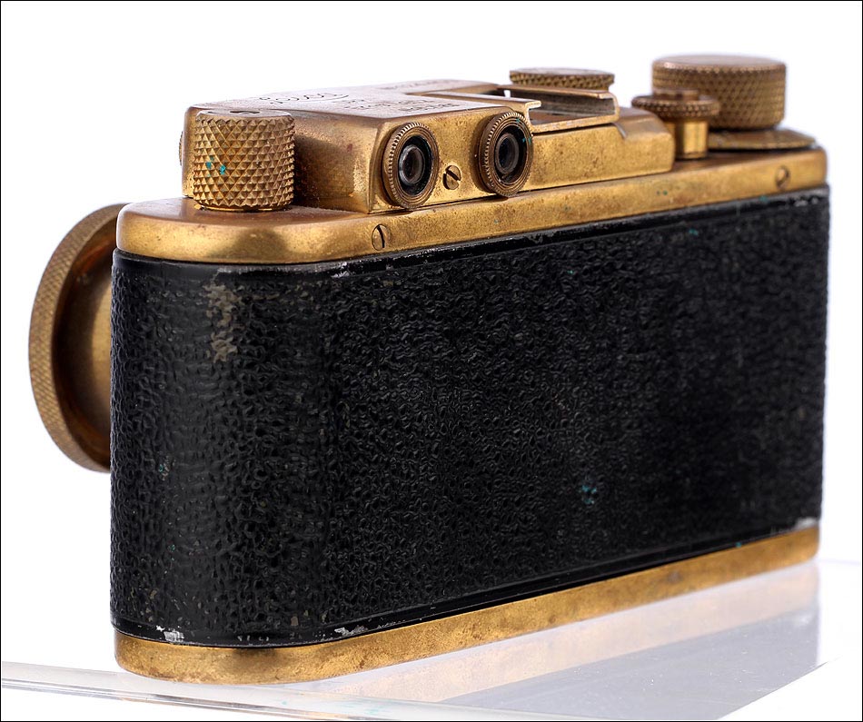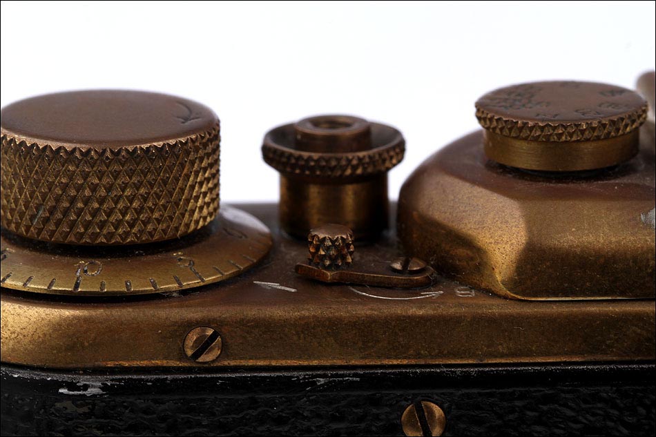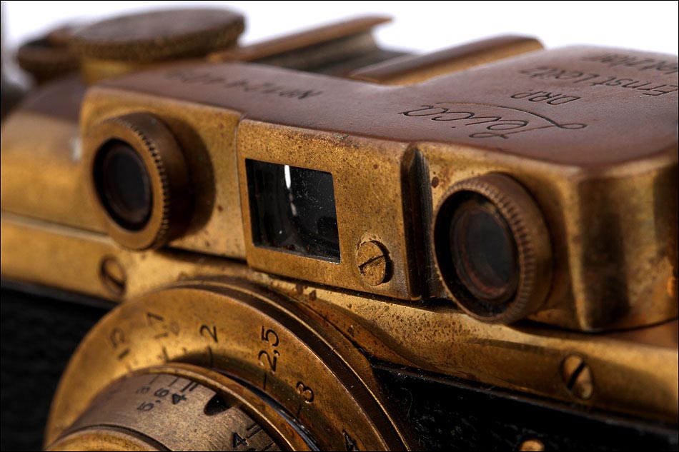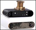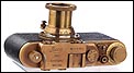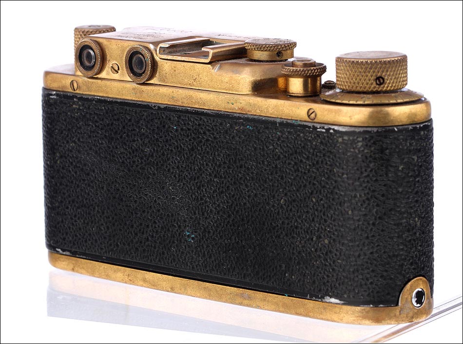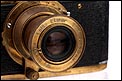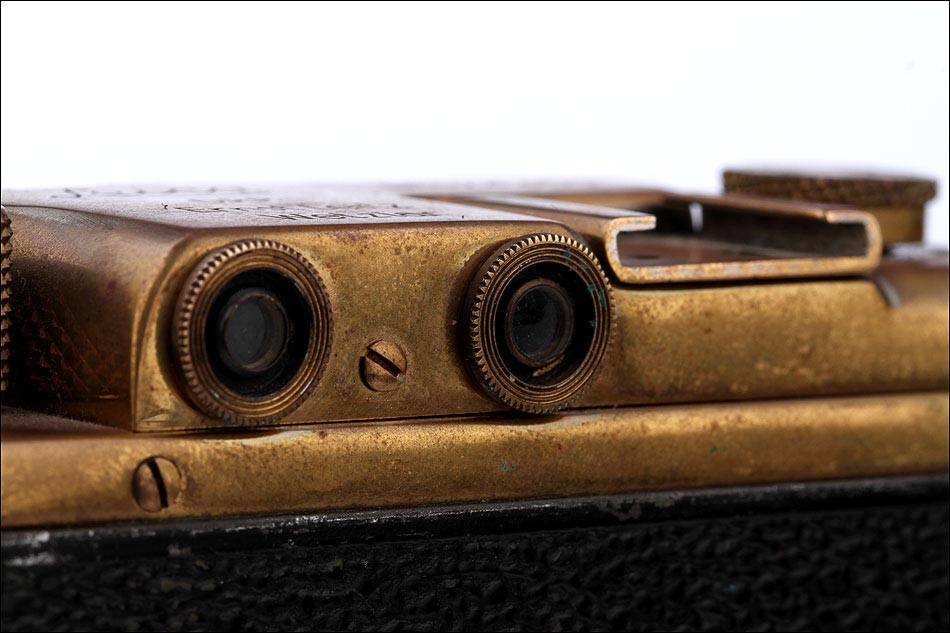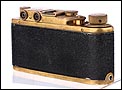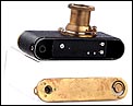 La cámara que vemos en estas fotos es el modelo Gold Luxus. Su nombre (gold significa oro en inglés) responde al color del material con el que está realizada la carcasa y los elementos móviles: latón pulido. Esta característica aporta a la cámara un curioso encanto y un aspecto muy atractivo. En la parte superior está grabado el número de serie 144700, y también otros detalles destinados a imitar a las Leica auténticas: el logotipo (que también aparece en la tapa del objetivo) y el nombre de la empresa fabricante de las cámaras alemanas, Ernst Leitz Wetzlar.