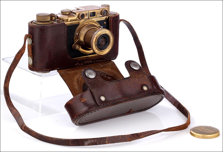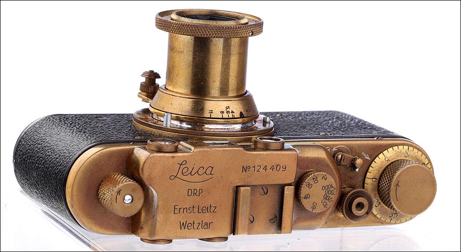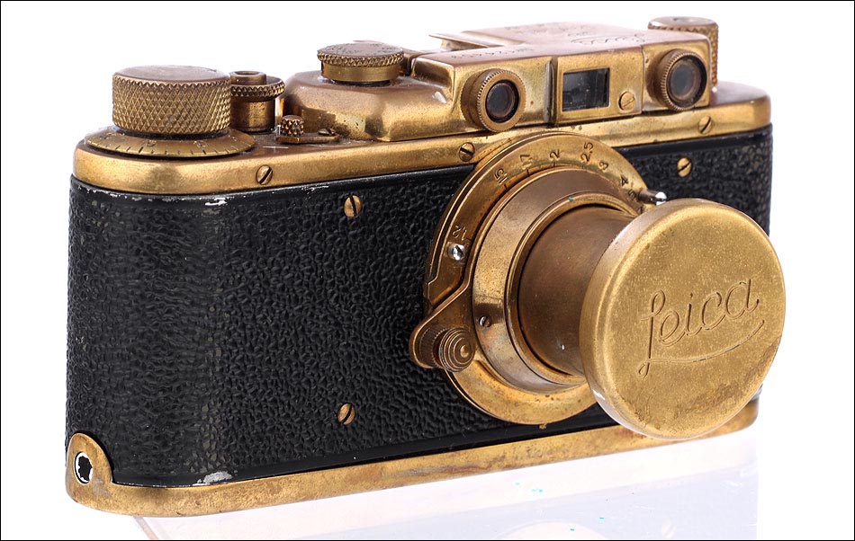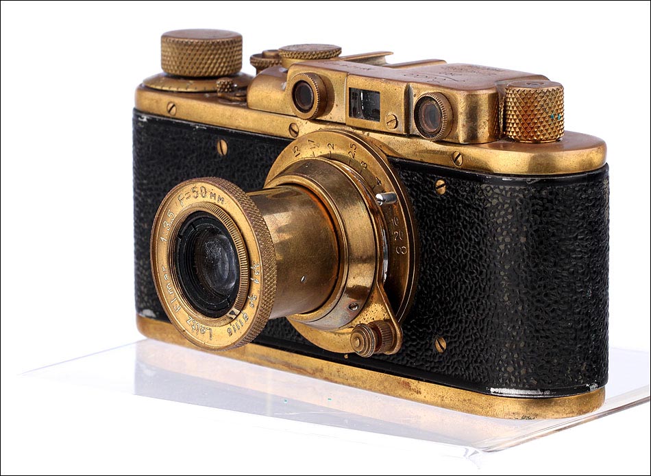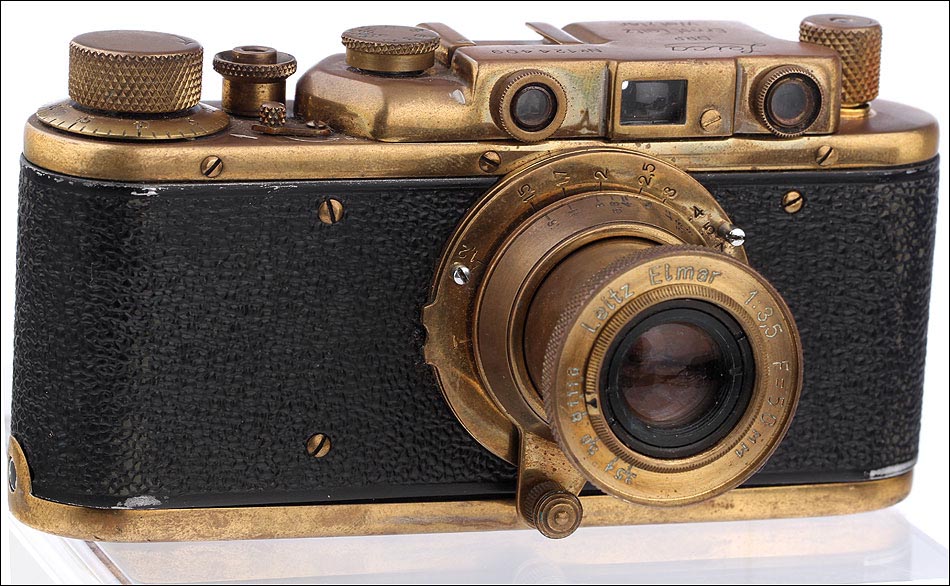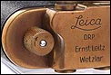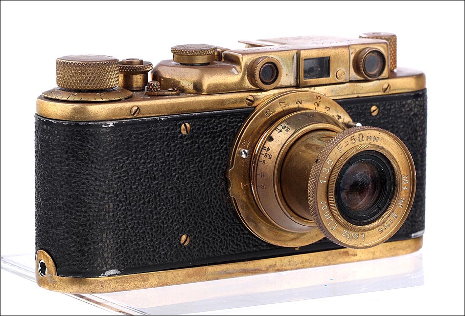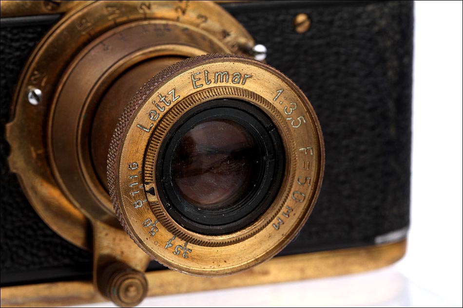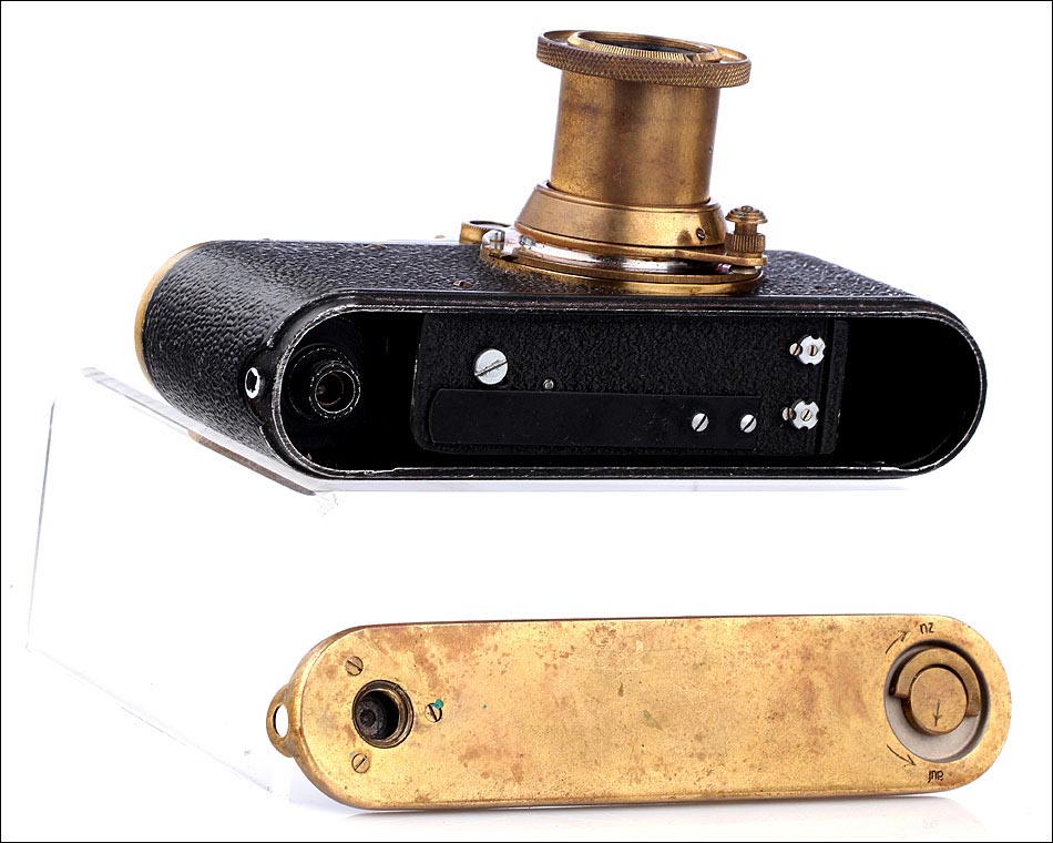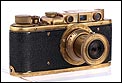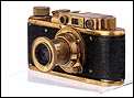 La cámara que vemos en estas fotos es el modelo Gold Luxus. Su nombre (gold significa oro en inglés) responde al color del material con el que está realizada la carcasa y los elementos móviles: latón pulido. Esta característica aporta a la cámara un curioso encanto y un aspecto muy atractivo. En la parte superior está grabado el número de serie 144700, y también otros detalles destinados a imitar a las Leica auténticas: el logotipo (que también aparece en la tapa del objetivo) y el nombre de la empresa fabricante de las cámaras alemanas, Ernst Leitz Wetzlar.