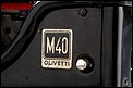 La máquina de escribir que vemos en estas imágenes es una M40, el tercer modelo que lanzó la compañía y que comenzó a fabricarse en 1930. Esta máquina en concreto data de los años 40 del siglo XX. Lleva el nombre de la compañía impreso en el porta-papeles y dos sellos con el nombre y el modelo en la parte frontal. El teclado está formado por piezas redondas, con fondo negro y símbolos blancos y en color ocre. Es un teclado español que incluye la letra Ñ y que se muestra en excelente estado de conservación. En la parte posterior de la máquina podemos ver una inscripción en letras blancas con la leyenda FABRICADA EN ESPAÑA.