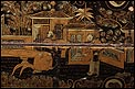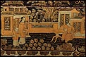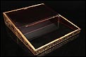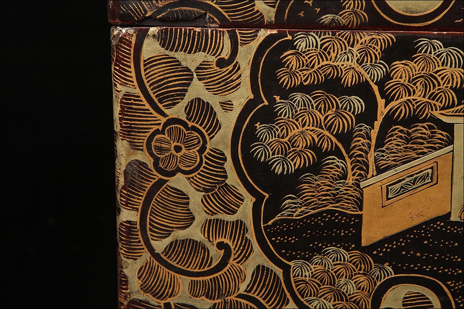 La decoración exterior muestra una serie de escenas costumbristas típicamente orientales, realizadas con pericia y habilidad por un excelente artista. Las cinco escenas (una en la tapa y cuatro en las caras laterales) tienen lugar en el mismo escenario, un conjunto de templetes y arquitecturas de estilo oriental rodeados de bosques y vegetación. La escena de la tapa muestra una serie de personajes masculinos y femeninos, que rodean a un hombre sentado ante una mesa redonda. El resto de las escenas muestran distintas secuencias, con dos o más personajes en el mismo lugar; en algunas de ellas aparece también la mesa. Todos los motivos están realizados con lacas en distintos tonos dorados sobre fondo negro.