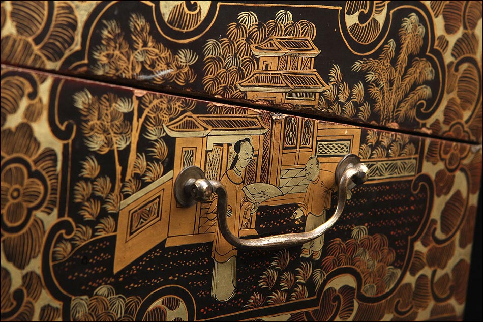 Esta atractiva pieza es una escribanía antigua, fabricada a finales del siglo XIX (circa 1900) para el mercado chino. La escribanía es de madera lacada y su exterior muestra una fantástica decoración de chinerías, realizada en distintos tonos dorados sobre fondo negro. La superficie lacada se encuentra en muy buen estado, sin golpes ni partes desportilladas. El exterior de la escribanía conserva las asas de metal, el tirador del cajón secreto, los ganchos de cierre y las bisagras originales. La cerradura es también la original, aunque la llave no se conserva.