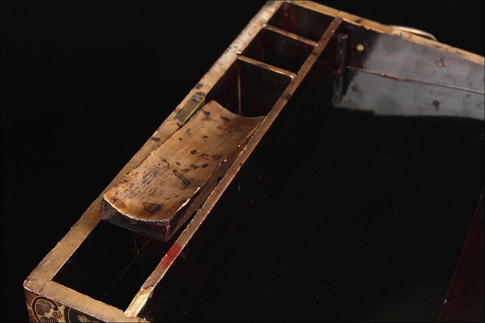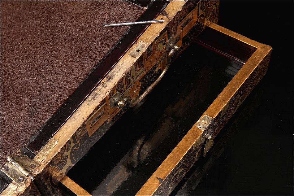Una vez abierta, la escribanía muestra una superficie de escritura revestida con piel de color marrón rojizo. La piel está también en muy buen estado, completa y sin roturas. La madera que la rodea está pintada con laca dorada, con un tono brillante que contrasta con la oscura superficie de cuero. En la parte superior podemos ver los clásicos compartimentos destinados a cobijar los útiles de escritorio. Las piezas de madera son las originales y muestran señales de un intenso uso, signos que aportan vida y personalidad a esta bella antigüedad.