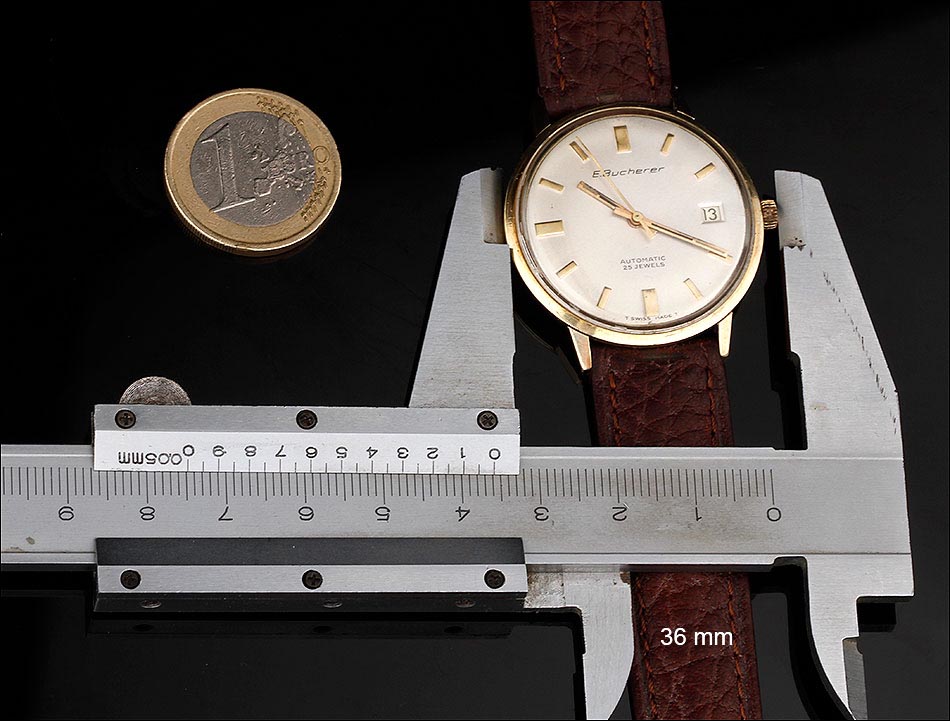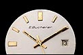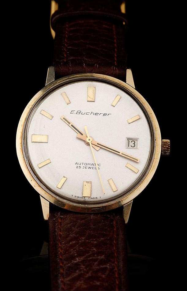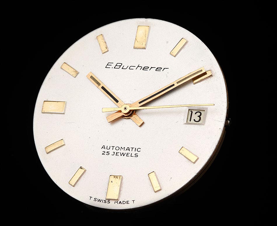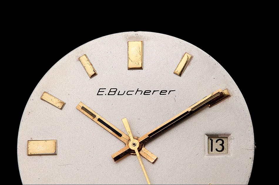 La esfera del reloj es blanca, y los números están señalados mediante piezas rectangulares de oro. Las manecillas son también de oro, rectangulares y de diseño racionalista. En la parte superior de la esfera podemos ver la firma E. BUCHERER impresa en letras negras. La empresa de Carl F. Bucherer se fundó en Lucerna en 1888 y es propiedad de la familia del mismo nombre. En 1919, esta empresa adquirió fama mundial al presentar su primera colección de relojes contemporáneos de lujo para señora, dentro del segmento Premium. Actualmente la empresa sigue existiendo y es un referente en el campo de los relojes de alta gama.
