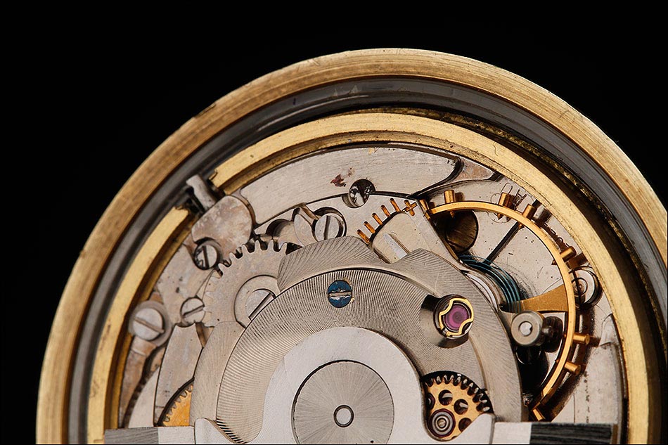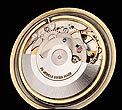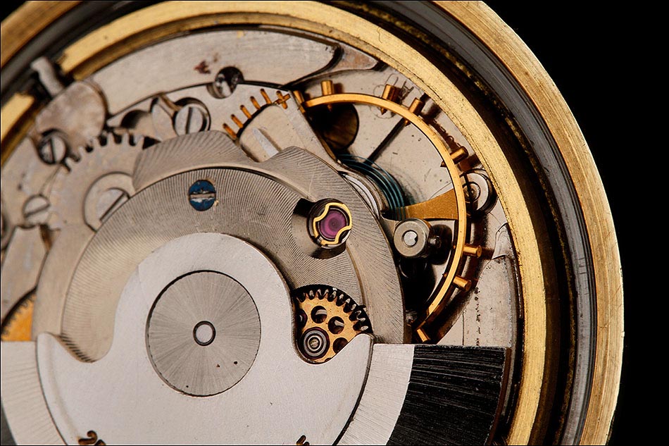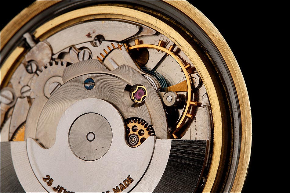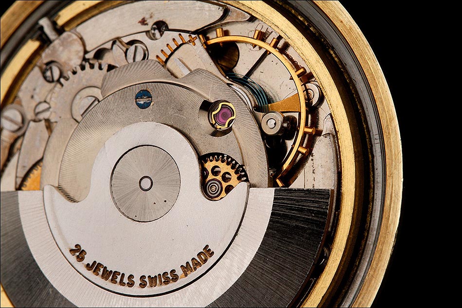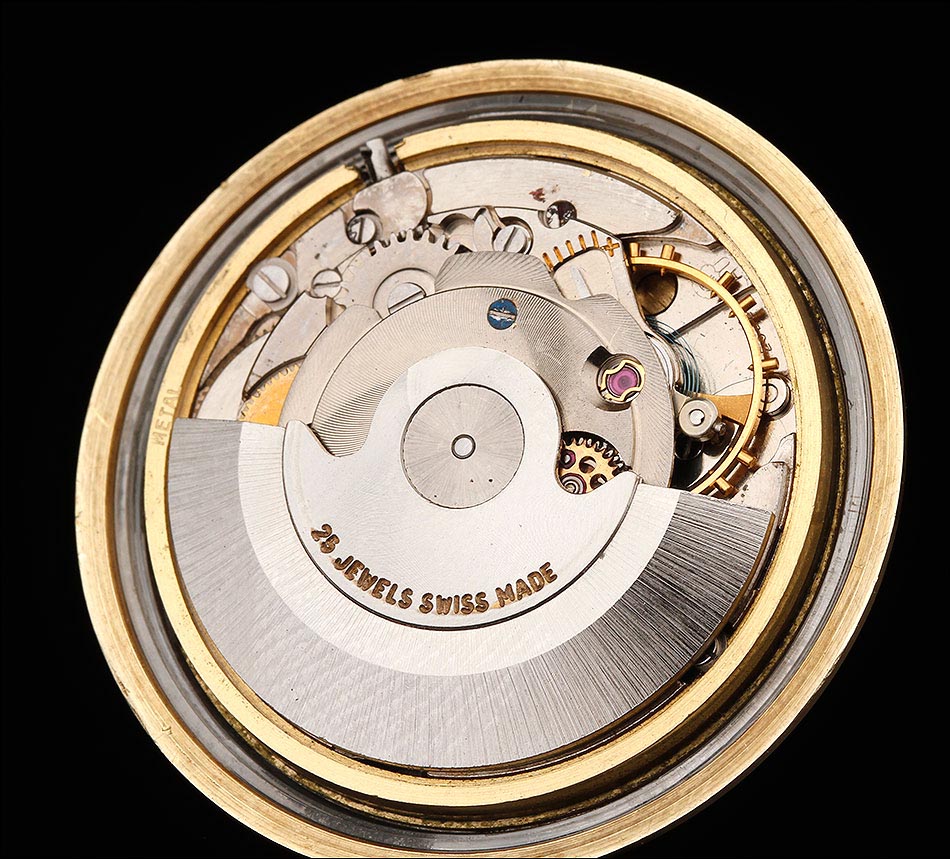 En la parte inferior de la esfera vemos otra inscripción: AUTOMATIC 25 JEWELS, que indica el tipo de mecanismo que lleva el reloj. Una inscripción similar, 25 JEWELS SWISS MADE, aparece grabada en la maquinaria. Ésta conserva todas sus piezas y engranajes originales, en perfecto estado y de una delicadeza y precisión impresionante. La parte trasera del reloj lleva varios sellos y contrastes referentes a la calidad y el origen del oro con el que está realizado. También podemos ver el número de serie 25201 grabado en el noble metal.