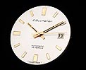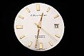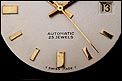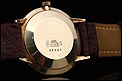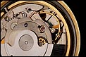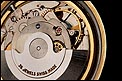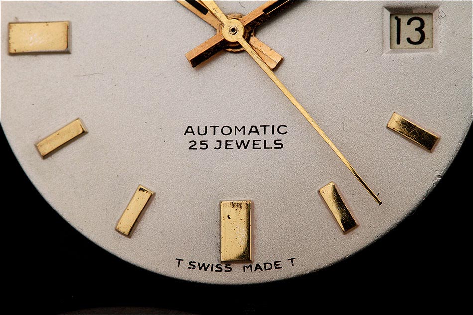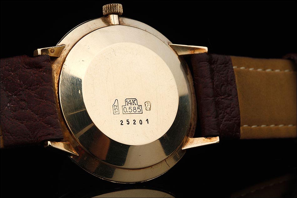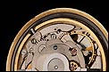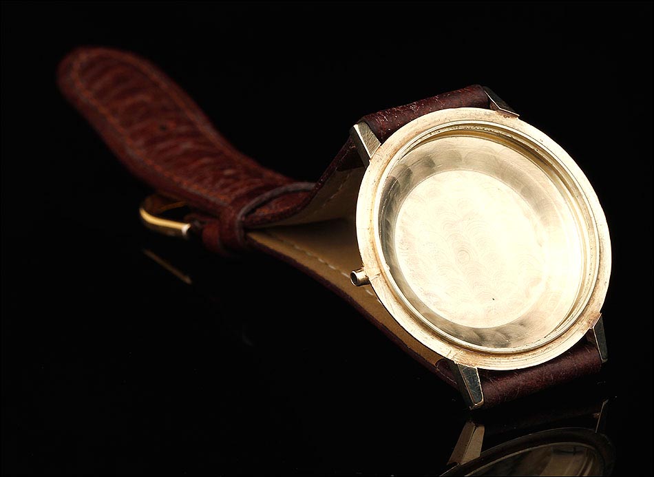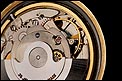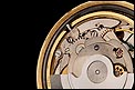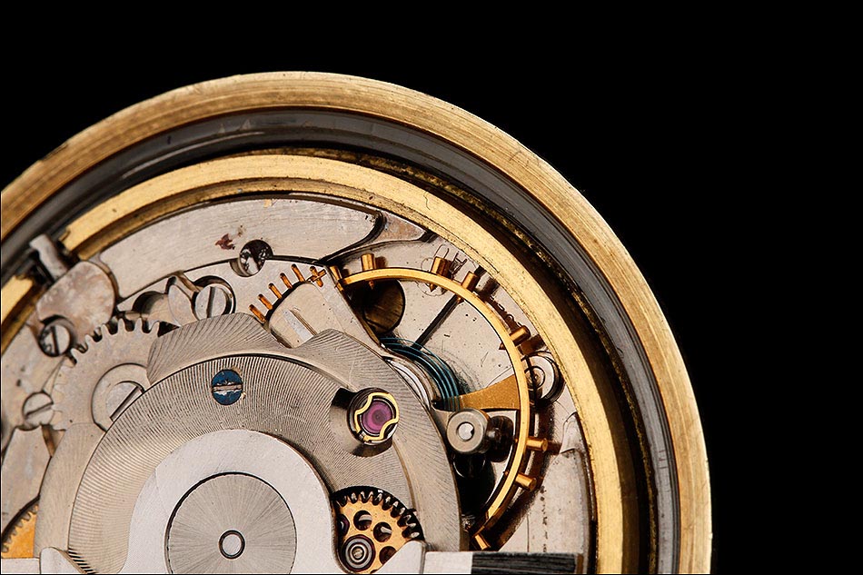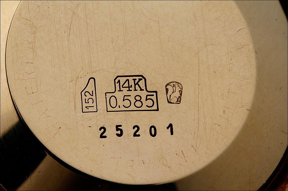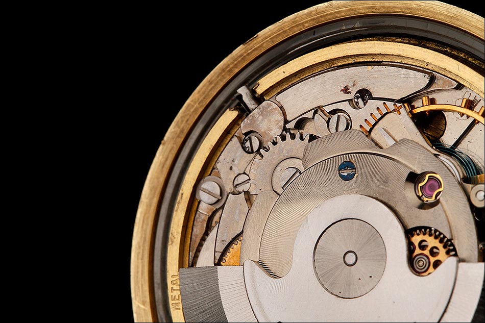 En la parte inferior de la esfera vemos otra inscripción: AUTOMATIC 25 JEWELS, que indica el tipo de mecanismo que lleva el reloj. Una inscripción similar, 25 JEWELS SWISS MADE, aparece grabada en la maquinaria. Ésta conserva todas sus piezas y engranajes originales, en perfecto estado y de una delicadeza y precisión impresionante. La parte trasera del reloj lleva varios sellos y contrastes referentes a la calidad y el origen del oro con el que está realizado. También podemos ver el número de serie 25201 grabado en el noble metal.
