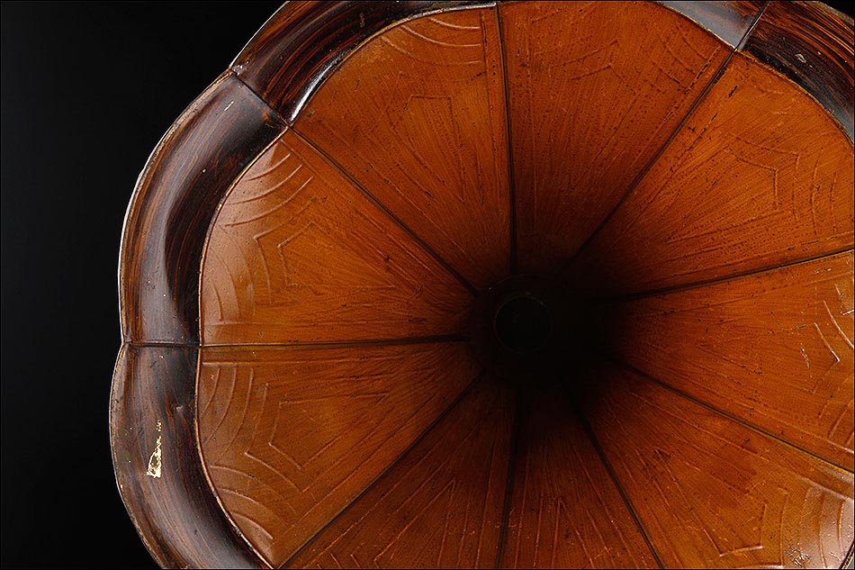 Mención aparte merece la magnífica trompeta del gramófono, una preciosa pieza realizada en metal. Lleva el clásico diseño lobulado de estos aparatos que recuerda a los pétalos de una flor. El metal ha sido cuidadosamente decorado a mano con el objetivo de imitar en lo posible maderas nobles. El interior y el exterior de la trompeta están pintados en un tono ocre dorado más claro, mientras que el borde es de color marrón oscuro, creando un bello contraste.