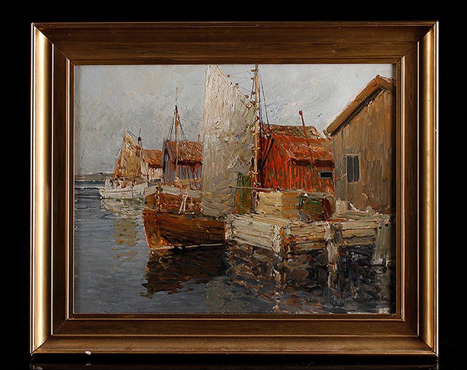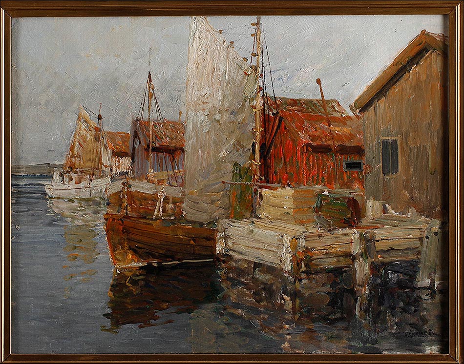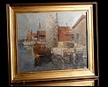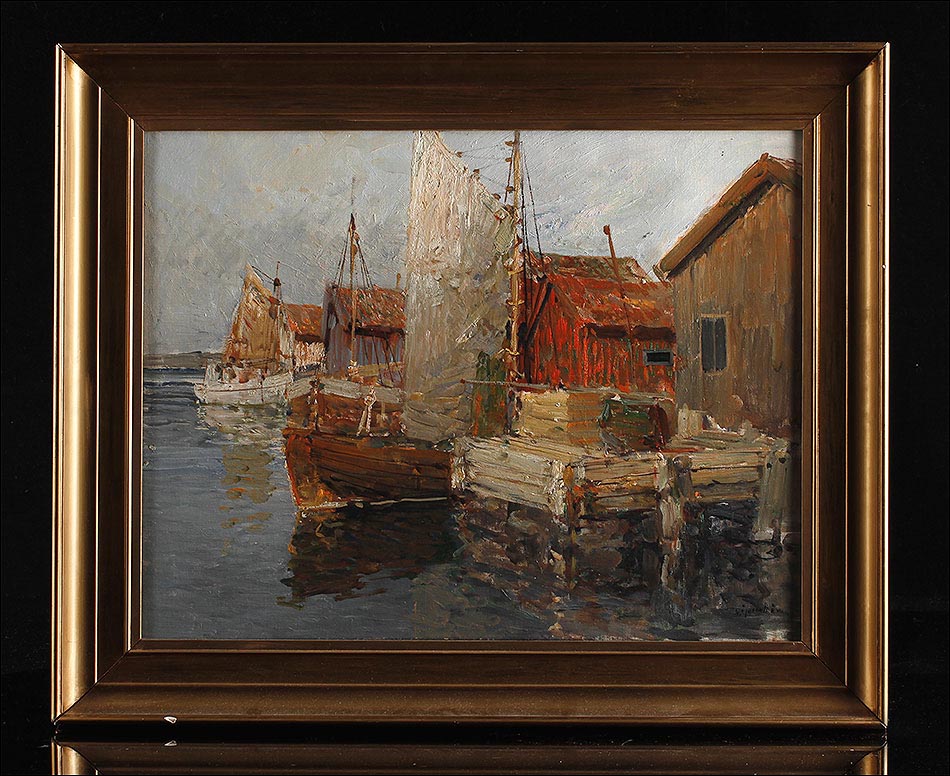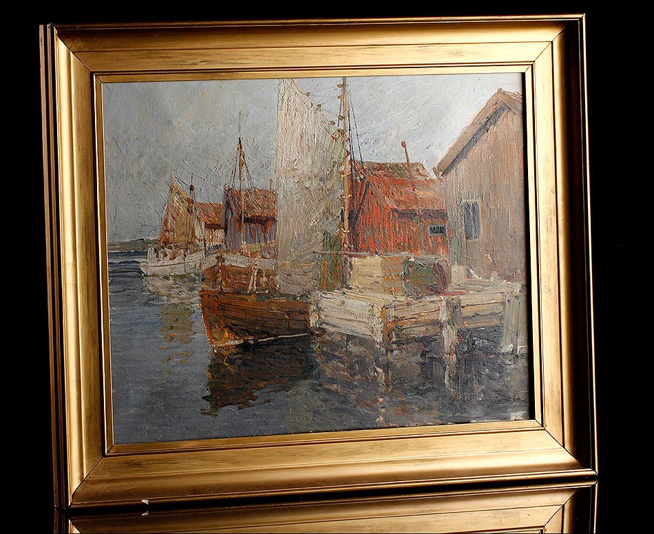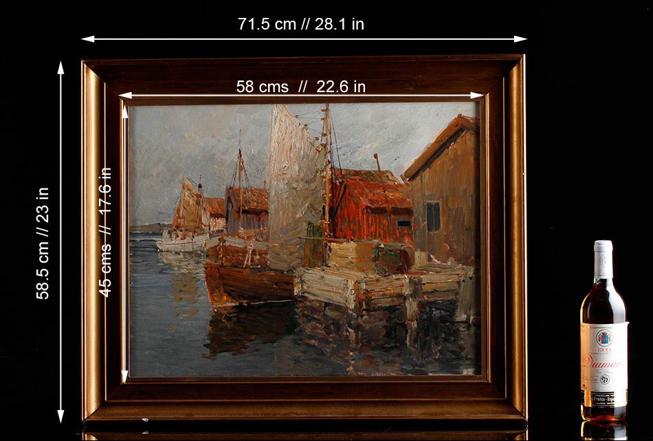 Este bellísimo cuadro al óleo es una obra de Hugo Öfverström, importante pintor moderno cuya obra se puede encontrar actualmente en prestigiosos museos de Suecia y Francia. El cuadro representa una temática muy querida para el autor, las escenas paisajísticas portuarias tratadas con un estilo muy personal, cercano al impresionismo. La pintura lleva por título "Pesqueros amarrados al puerto" y está perfectamente conservado, presentándose con un elegante marco dorado.