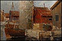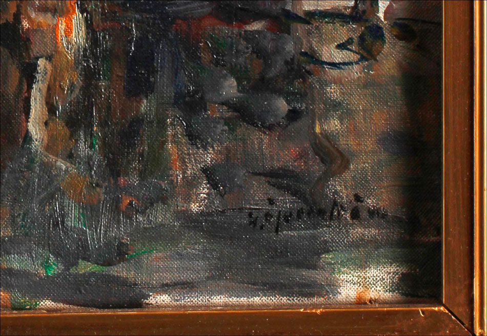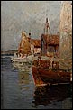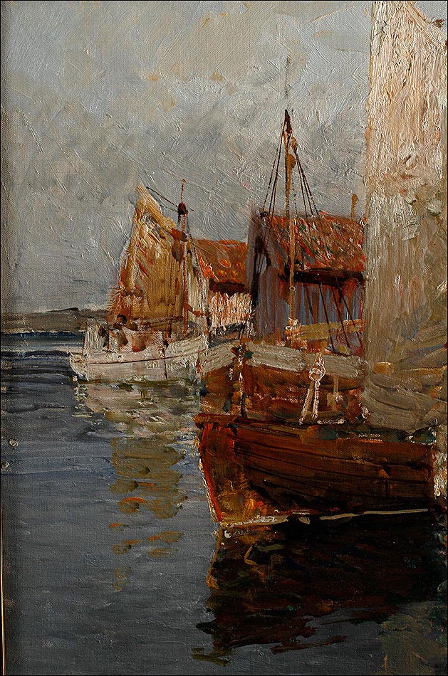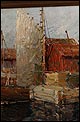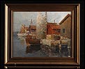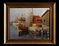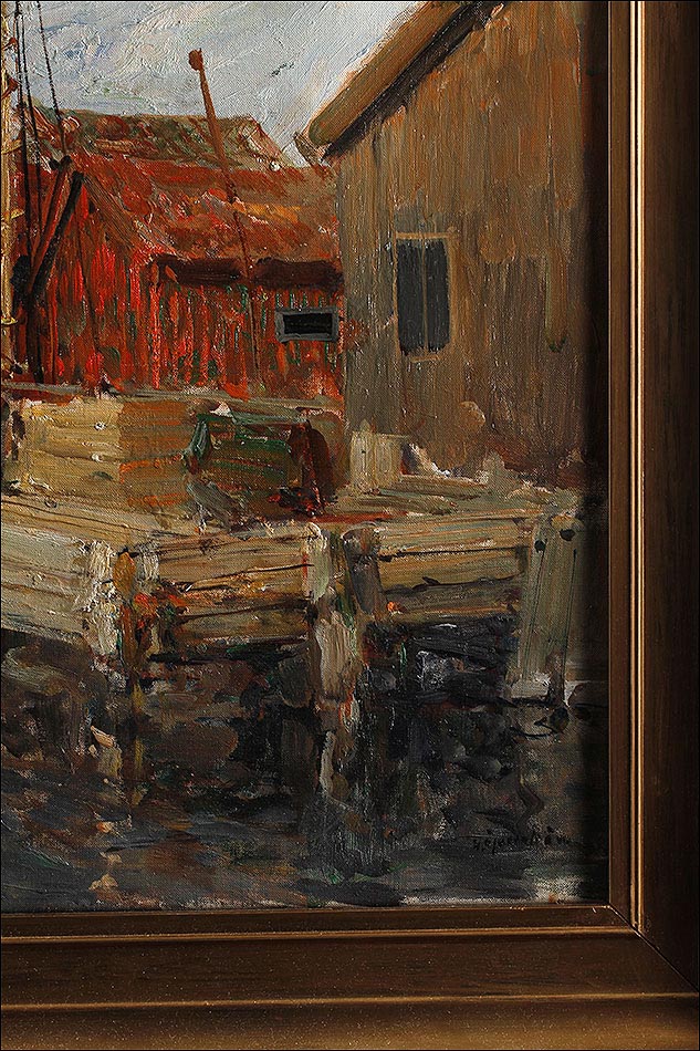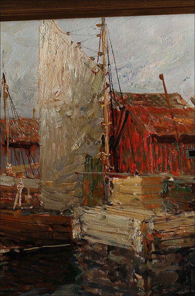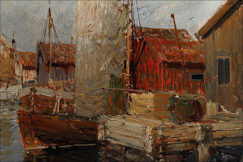Este bellísimo cuadro al óleo es una obra de Hugo Öfverström, importante pintor moderno cuya obra se puede encontrar actualmente en prestigiosos museos de Suecia y Francia. El cuadro representa una temática muy querida para el autor, las escenas paisajísticas portuarias tratadas con un estilo muy personal, cercano al impresionismo. La pintura lleva por título "Pesqueros amarrados al puerto" y está perfectamente conservado, presentándose con un elegante marco dorado.
