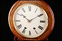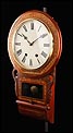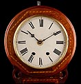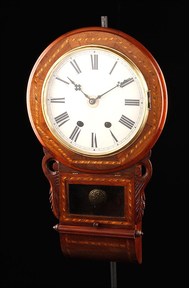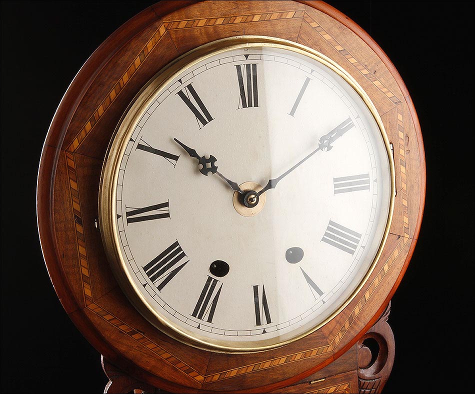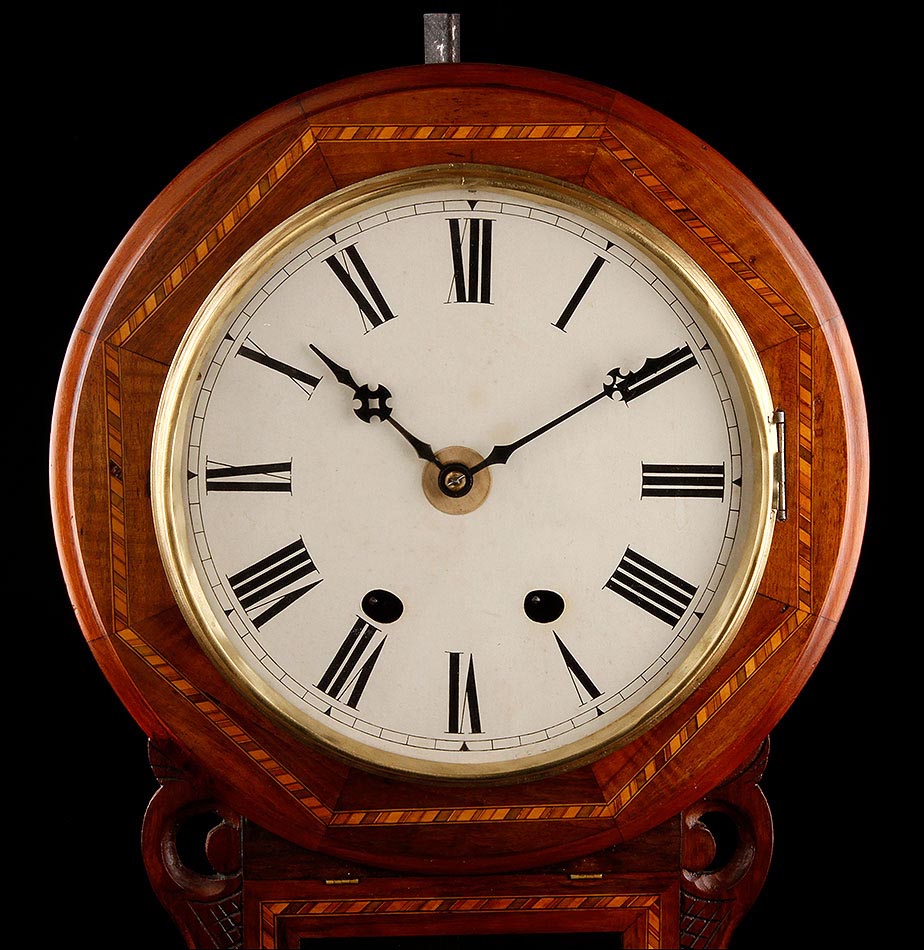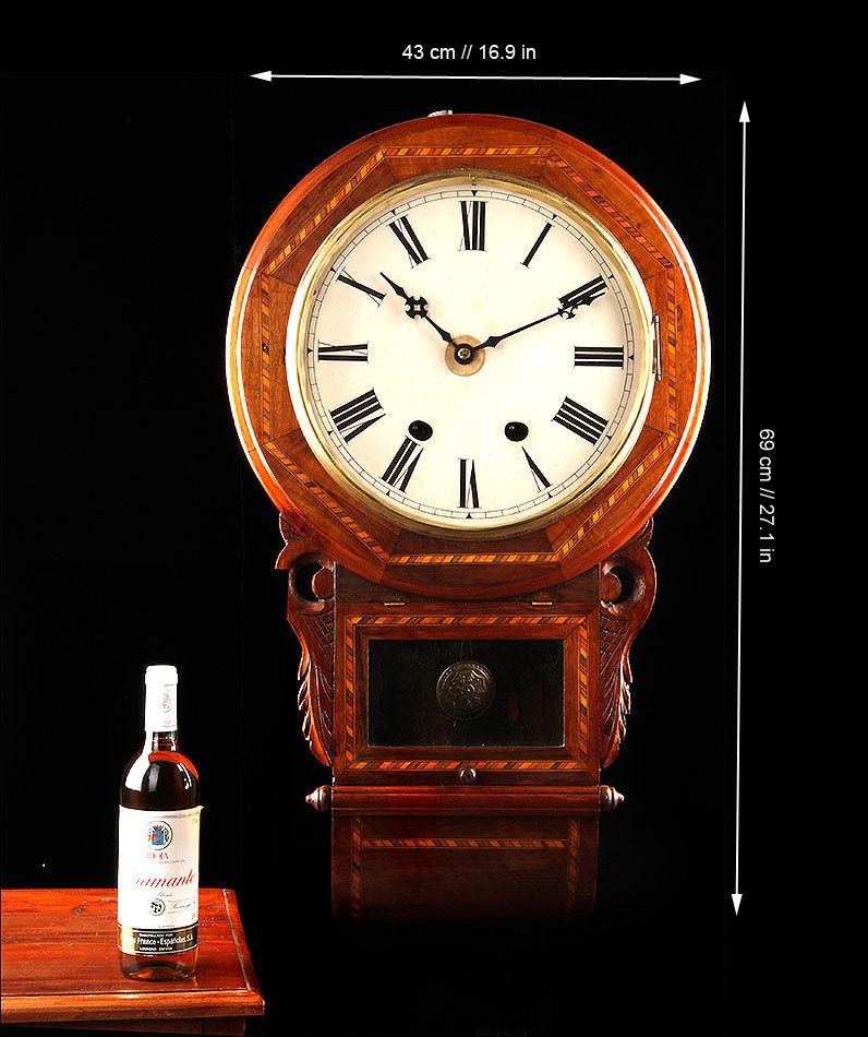 Este original reloj de pared es un modelo muy especial por su curioso diseño, muy actual y sorprendente en una pieza tan antigua. Es un reloj fabricado en Norteamérica en los años 20-30 del siglo XX, con caja de madera maciza y preciosos detalles decorativos en taracea. El reloj está muy bien conservado y se ha restaurado para mostrarse en todo su esplendor. La maquinaria también ha sido puesta a punto para garantizar un funcionamiento perfecto, de manera que el reloj da las horas y las medias con total precisión. La sonería es sobre gong.