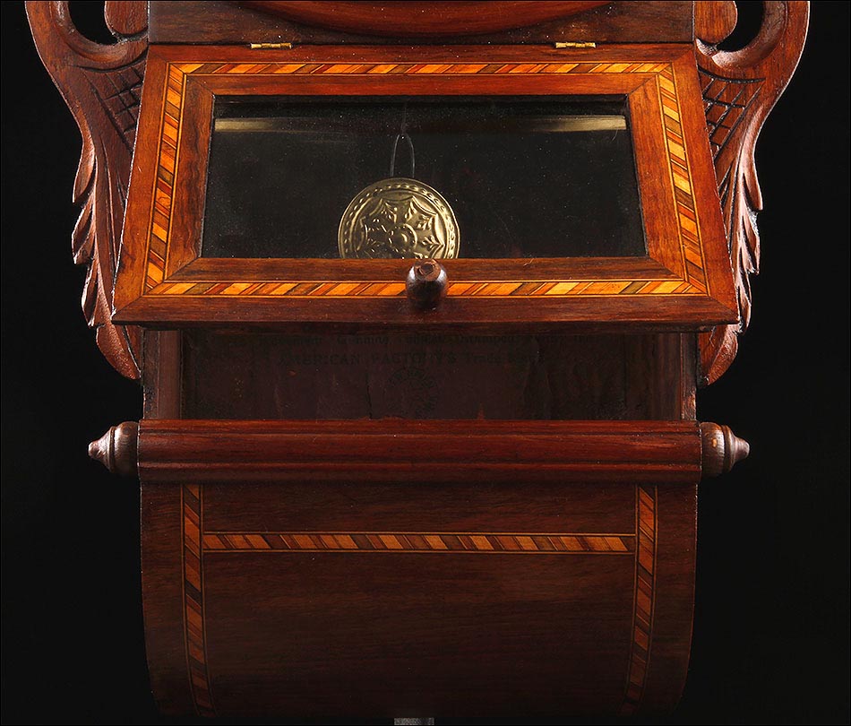 La caja es de un atractivo muy singular. Su parte superior, correspondiente a la esfera, tiene forma circular y no lleva adornos tallados ni torneados. Es un diseño muy limpio que adelanta las líneas a seguir por las artes decorativas modernas. La base es de madera de caoba maciza, adornada por un marco frontal compuesto por ocho piezas idénticas de madera de nogal con un filete de taracea en el centro. Los filetes de taracea se unen formando un delicado hexágono. Este adorno se repite en la parte inferior del reloj, tanto en la puerta del péndulo como en el detalle decorativo inferior.