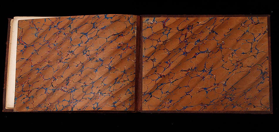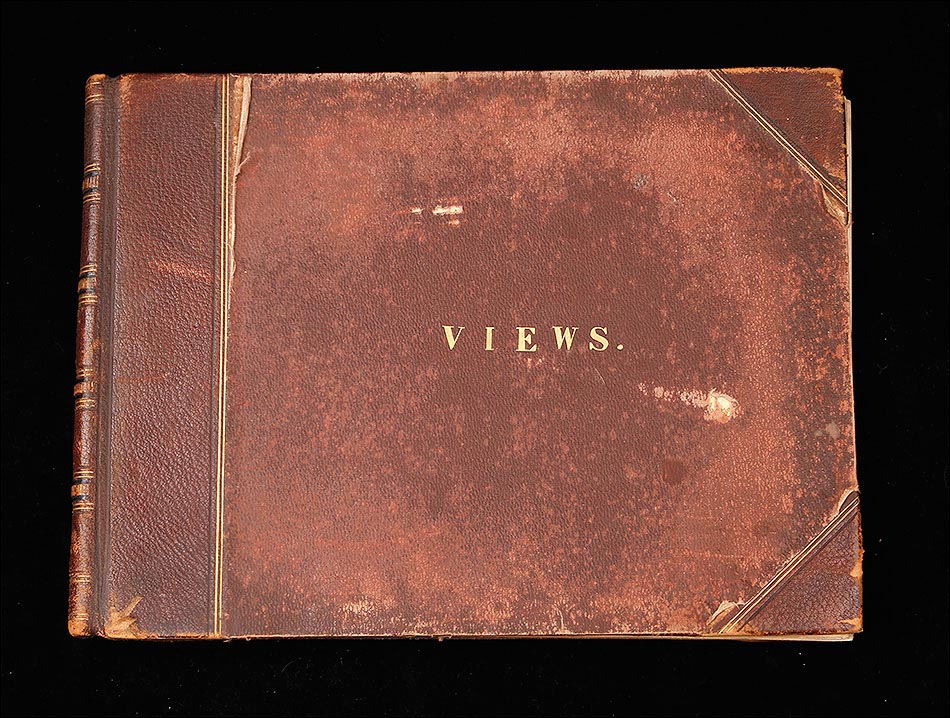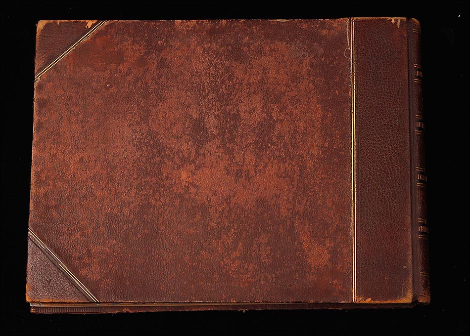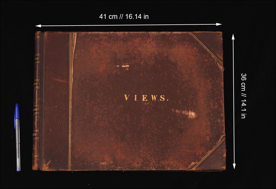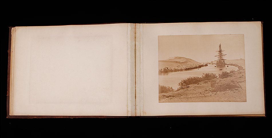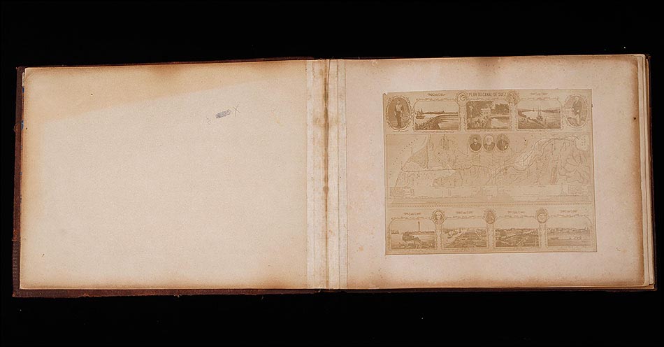 El álbum conserva su encuadernación original en piel marrón con lomo y esquinas reforzadas, todo en muy buen estado pese al paso de más de 130 años. En la portada, la palabra "VIEWS" en letras doradas anuncia el contenido: una ventana abierta al Egipto de finales del siglo XIX. En el interior, el papel de aguas que reviste las guardas añade un toque de refinada elegancia, típico de las ediciones de lujo de la época. Cada fotografía mide 27 x 22 cm y está montada sobre hojas rígidas. Además de las imágenes principales, se incluye un montaje con un grabado del Canal de Suez y representaciones geográficas de la zona.