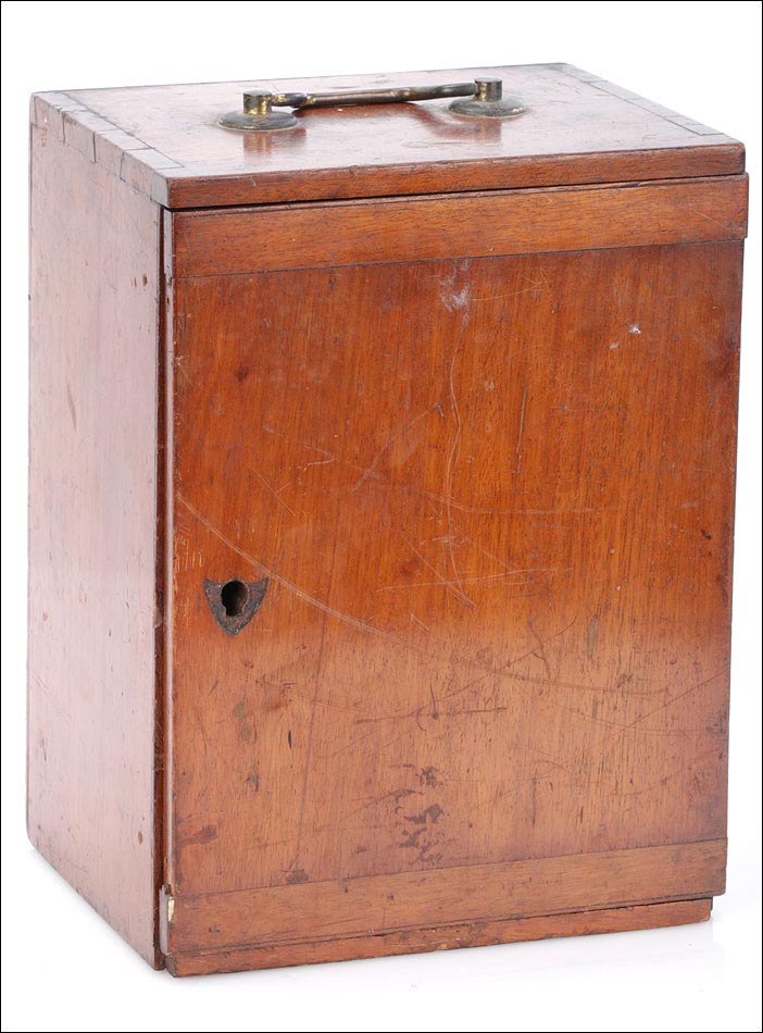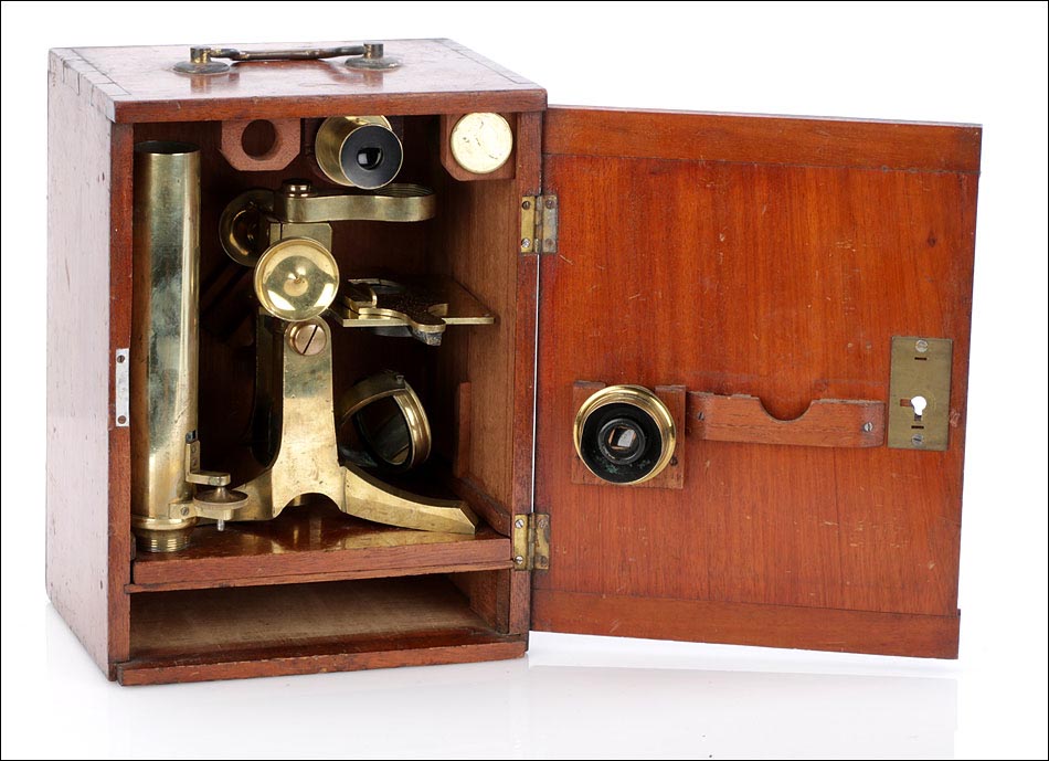 El microscopio se recoge para poderlo guardar cómodamente en su estuche original. Es una sólida caja de madera de caoba maciza, un material habitual en la confección de los estuche y maletines de guardado de los instrumentos científicos de época. La caoba es una madera que soporta bien las condiciones de humedad, y es más sólida que la mayoría del resto de las especies. Además, su tono rojizo y atractiva veta la convierten en una de las maderas nobles más bellas que hay. El estuche de este microscopio muestra signos de uso y del paso del tiempo, pero está completo y su estructura es sólida. Las uniones en cola de milano son artesanales, y el asa de metal es la original.