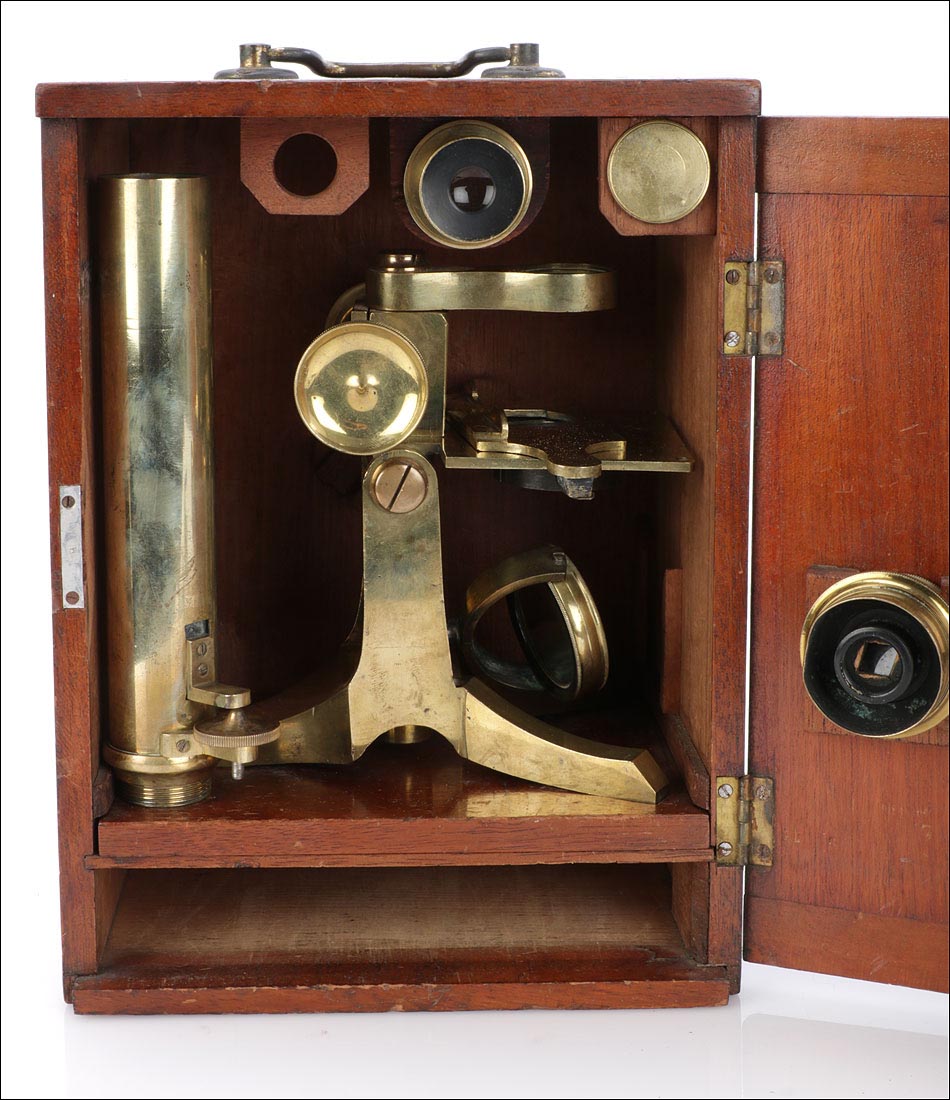 Antiguo Microscopio de Latón en Estuche de Caoba. Inglaterra 1890-1900 |