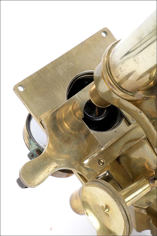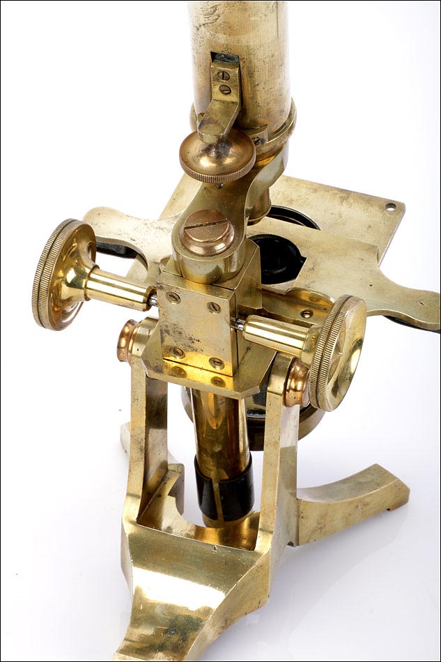 El microscopio está fabricado íntegramente en latón. El metal muestra una superficie lisa y pulida, sin rastros de óxido o signos de deterioro. Bajo la pletina para las muestras, el microscopio conserva el espejo de doble cara (cóncava y convexa) original. Por otra parte, los tornillos y el mecanismo que hacen posible enfocar la visión de las muestras funcionan muy bien, de forma fluida y suave.