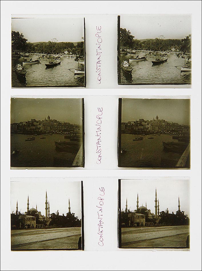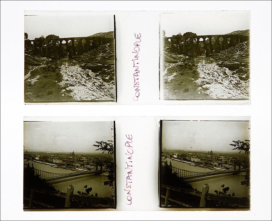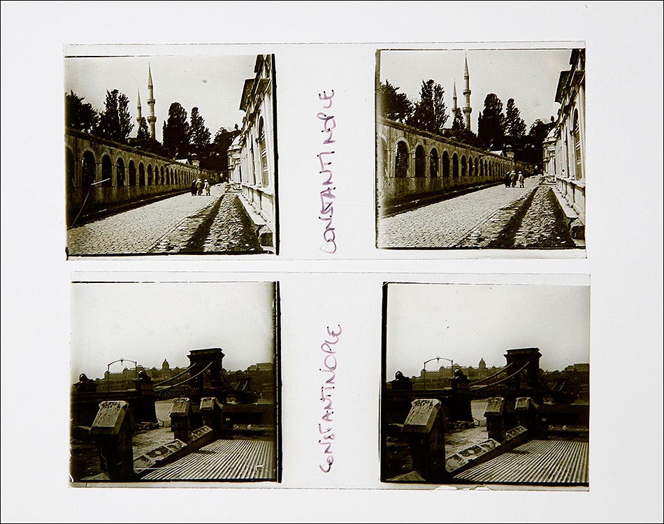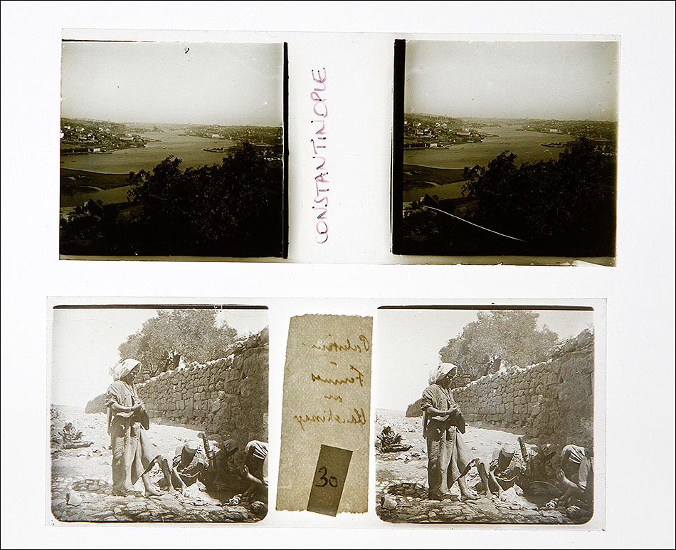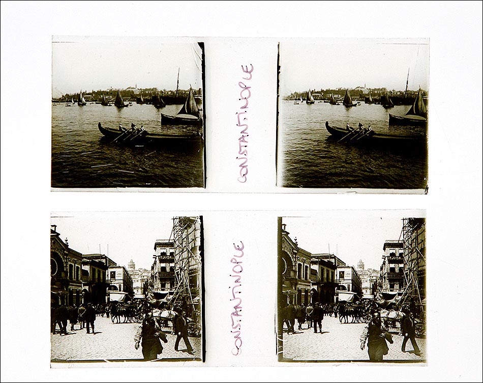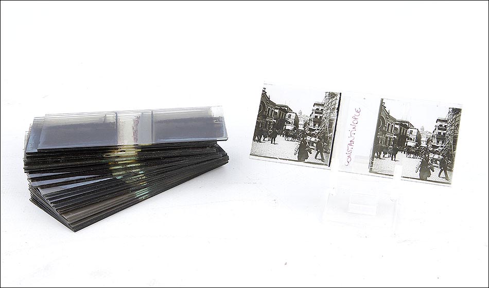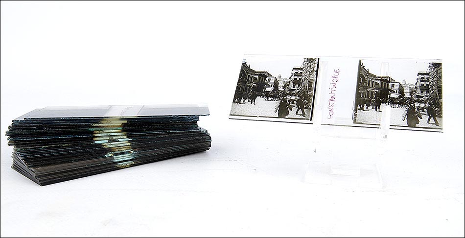 Atractivo juego de 25 placas estereoscópicas sobre cristal, tomadas a principios del siglo XX en diferentes países. Las placas están tituladas a mano y en francés con los nombres de las ciudades y países cuyos rincones reflejan: Constantinopla, Beirut, Siria y Turquía. Las imágenes, en blanco y negro y en tonos sepia, reflejan rincones de las ciudades, paisajes evocadores y momentos de la vida cotidiana de sus habitantes. Estas últimas llaman la atención por el encanto costumbrista que reflejan y por la autenticidad de las escenas. Las placas se encuentran en muy buen estado de conservación y pueden visualizarse claramente con la ayuda de un visor estereoscópico.