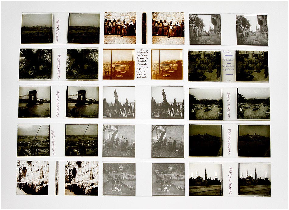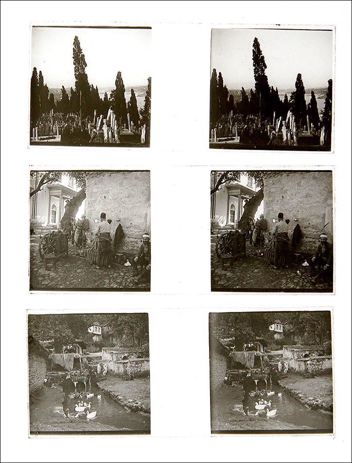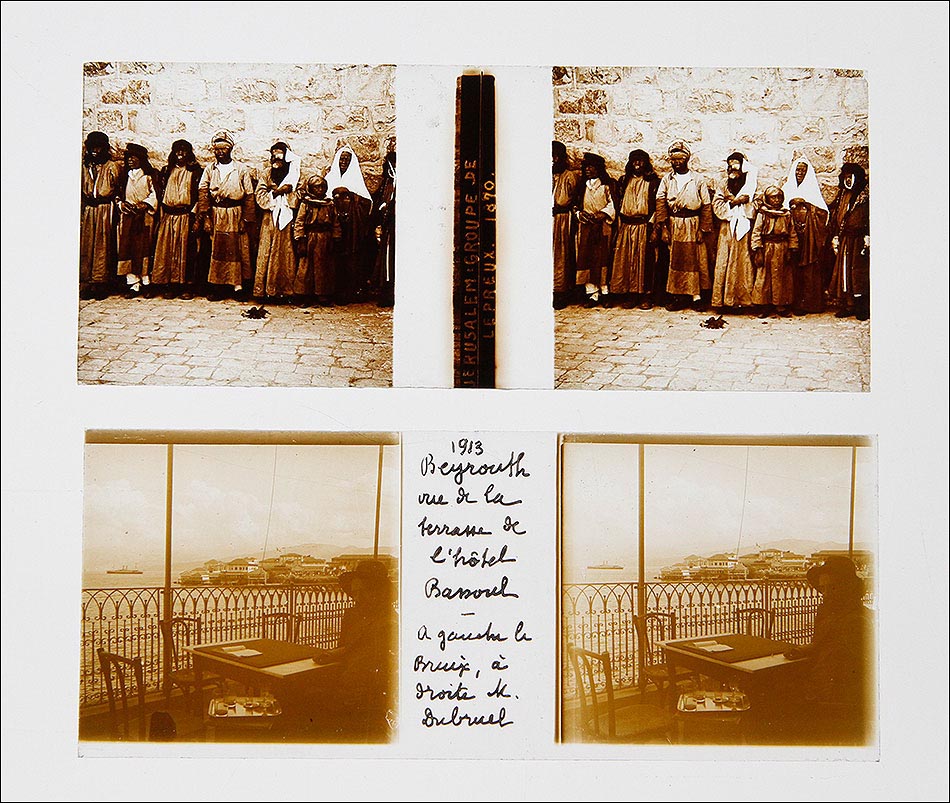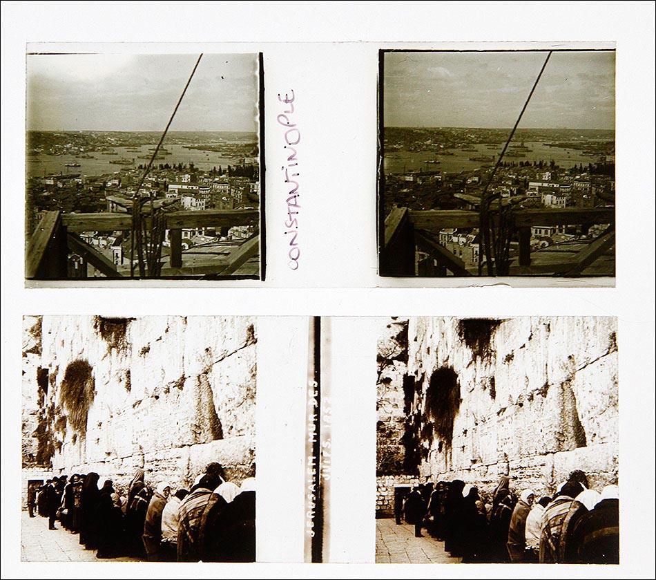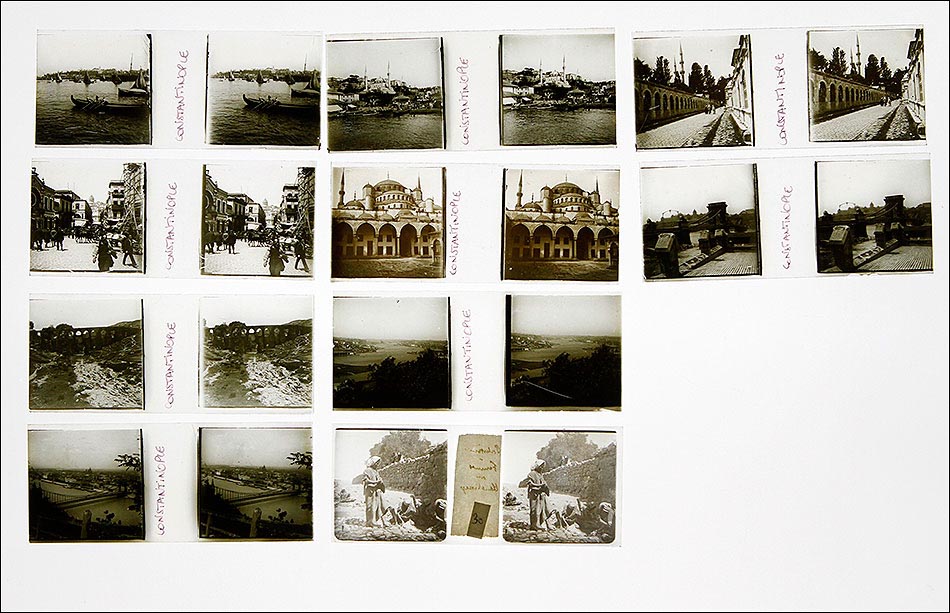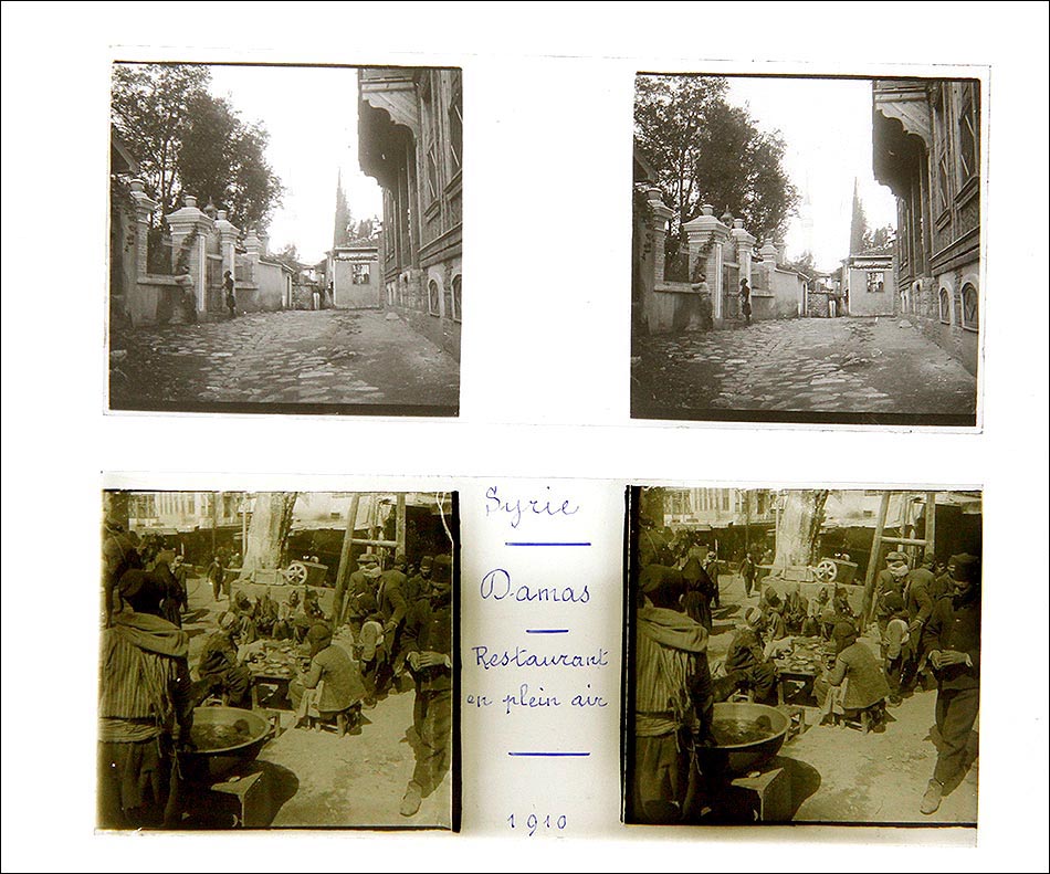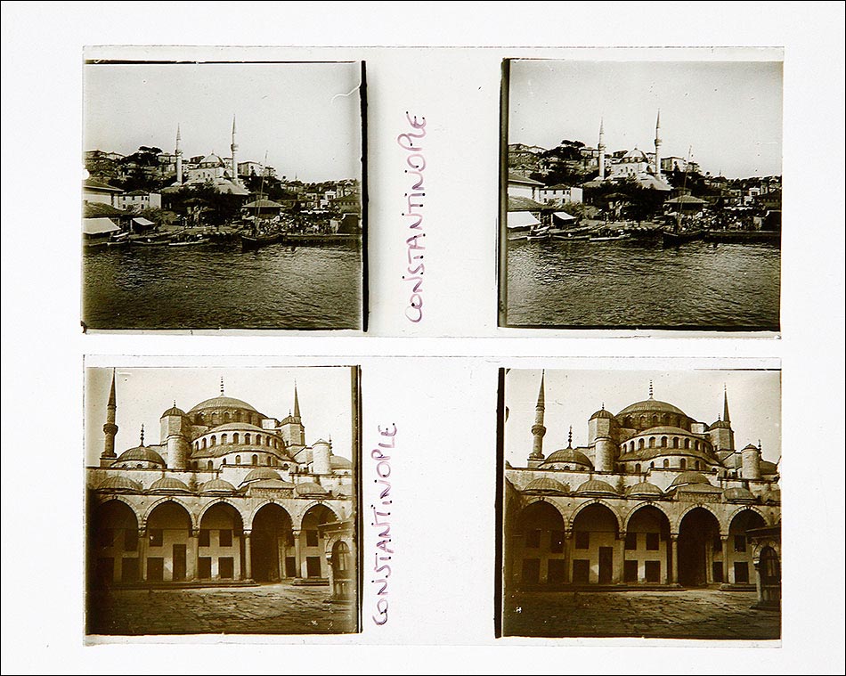 Atractivo juego de 25 placas estereoscópicas sobre cristal, tomadas a principios del siglo XX en diferentes países. Las placas están tituladas a mano y en francés con los nombres de las ciudades y países cuyos rincones reflejan: Constantinopla, Beirut, Siria y Turquía. Las imágenes, en blanco y negro y en tonos sepia, reflejan rincones de las ciudades, paisajes evocadores y momentos de la vida cotidiana de sus habitantes. Estas últimas llaman la atención por el encanto costumbrista que reflejan y por la autenticidad de las escenas. Las placas se encuentran en muy buen estado de conservación y pueden visualizarse claramente con la ayuda de un visor estereoscópico.