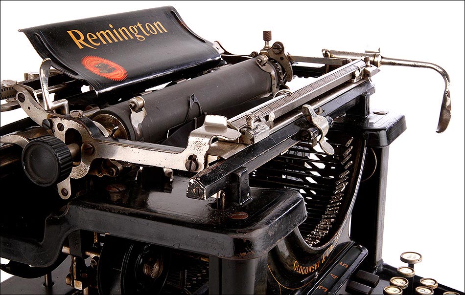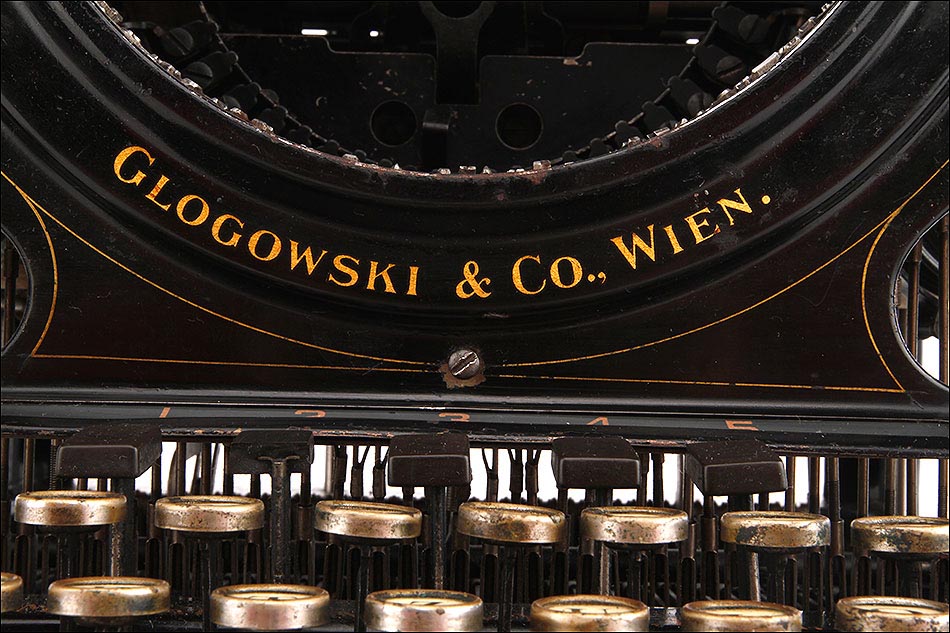En la parte delantera de esta bella máquina de escribir, encima del teclado podemos ver la inscripción GLOGWSKI & CO. WIEN. Es el nombre de una desaparecida escuela de mecanografía situada en Viena, a la que probablemente perteneció la máquina. El teclado situado inmediatamente debajo está formado por piezas redondas, con fondo blanco y símbolos negros. Las teclas llevan el clásico anillo niquelado que las embellece y refuerza. Todas ellas son originales, funcionan perfectamente y se han conservado muy bien. En la parte trasera de la máquina vemos de nuevo el nombre Remington, impreso en letras doradas y en perfecto estado.