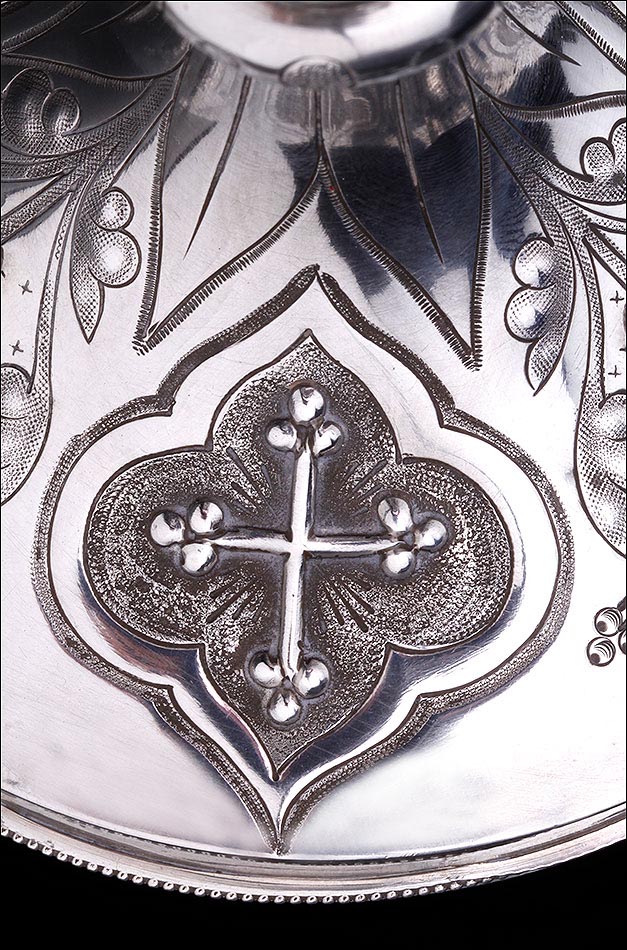 La copa del cáliz está diseñada a modo de flor: en la base encontramos una serie de hojas lanceoladas simétricas, con pequeñas flores intercaladas entre ellas. Los motivos están delicadamente sombreados con diminutos puntos, creando una decoración muy bella y sutil. La patena, por su parte, es muy sencilla y únicamente lleva una cruz griega grabada en el centro como ornamentación. El estuche está bien conservado; el exterior muestra lógicos signos del paso del tiempo y del uso, pero este detalle no resta atractivo al magnífico conjunto.