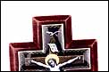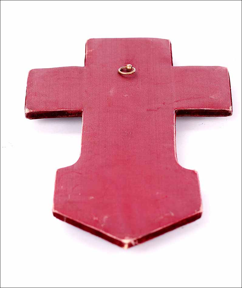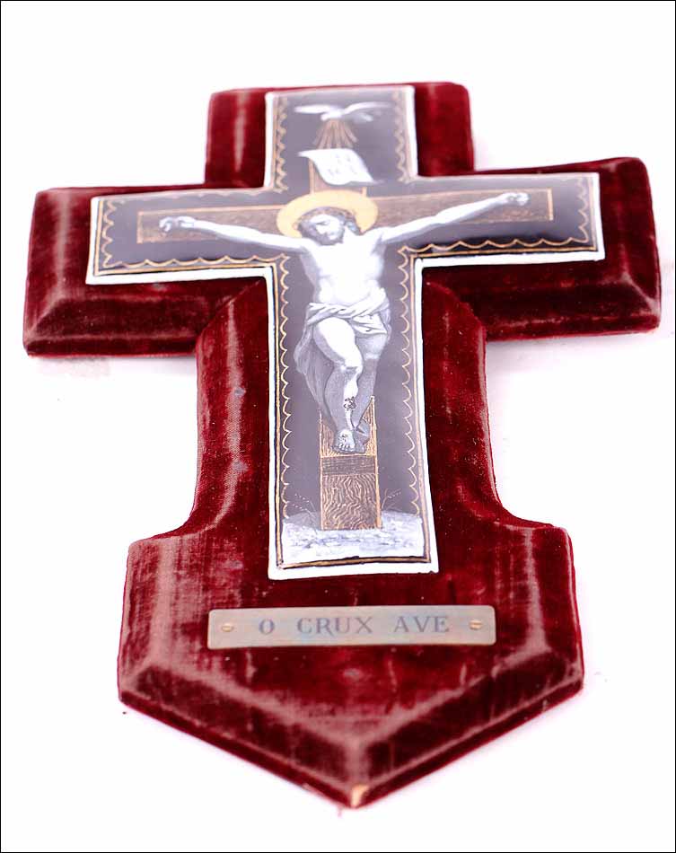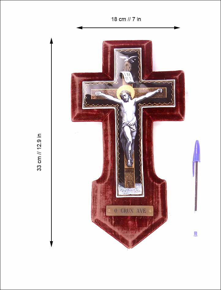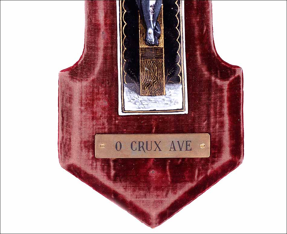 La imagen de Jesucristo está bien proporcionada, y las sombras recreadas por el artista logran una impresión de profundidad altamente realista. Sobre el dibujo de la cruz, en el que destaca la fina trama que crean las vetas de la madera, la figura de Jesús destaca con un brillo intenso. Sobre su cabeza vemos el clásico pergamino con la inscripción INRI, coronado por el símbolo del Espíritu Santo (una paloma). Bajo la cruz hay una placa de cobre con la inscripción O CRUX AVE. El soporte de madera forrado de terciopelo tiene una forma muy decorativa, con bordes biselados y un bello color granate que hace destacar los tonos del esmalte. En su parte trasera hay una argolla de latón para colgarlo de la pared.