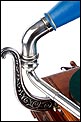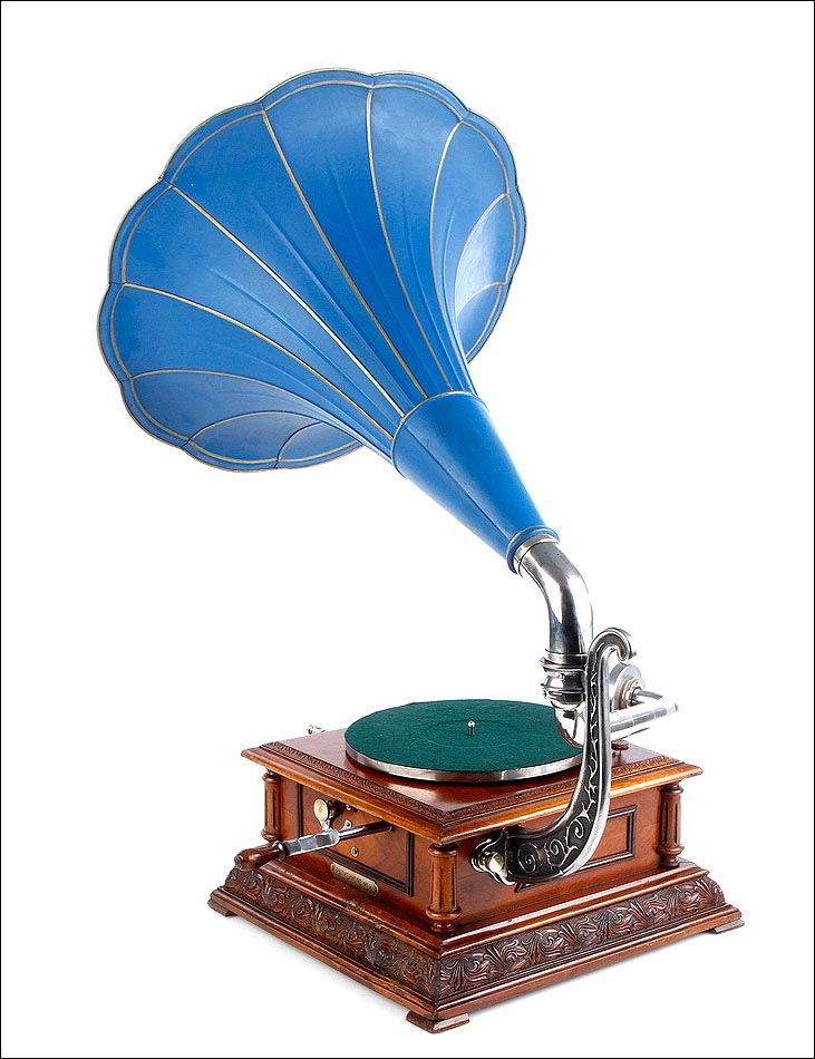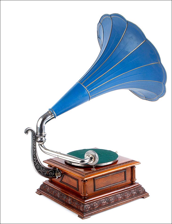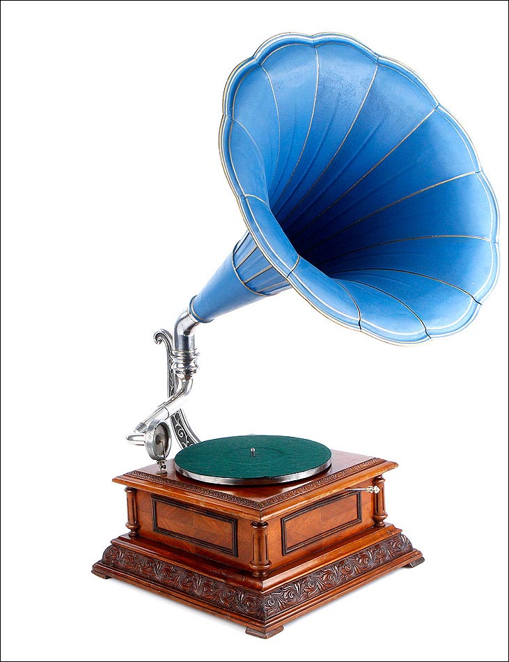 Este gramófono es un espectacular Pathephone nº8, fabricado en Francia alrededor del año 1915. Este era una edición de lujo de Pathé, uno de los más lujosos de su época. Era enormemente caro en comparación con otros y se fabricaron pocas unidades. Hoy día es uno de los gramófonos más buscados y cotizados por los coleccionistas. Como se ve, lleva una trompa azul muy bien conservada. La caja está fabricada en madera de caoba tropical, tallada a mano, con cuatro columnas en las esquinas también de caoba y molduras en los laterales. Absolutamente todas las piezas son originales de época. El motor está revisado y funciona de forma super silenciosa. La manivela es la suya, original de época. Los cromados son los originales. Solo los hemos pulido para devolverles su belleza. El fieltro del giraplatos es lo único que le hemos reemplazado. Le hemos puesto uno con su color original.