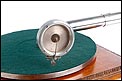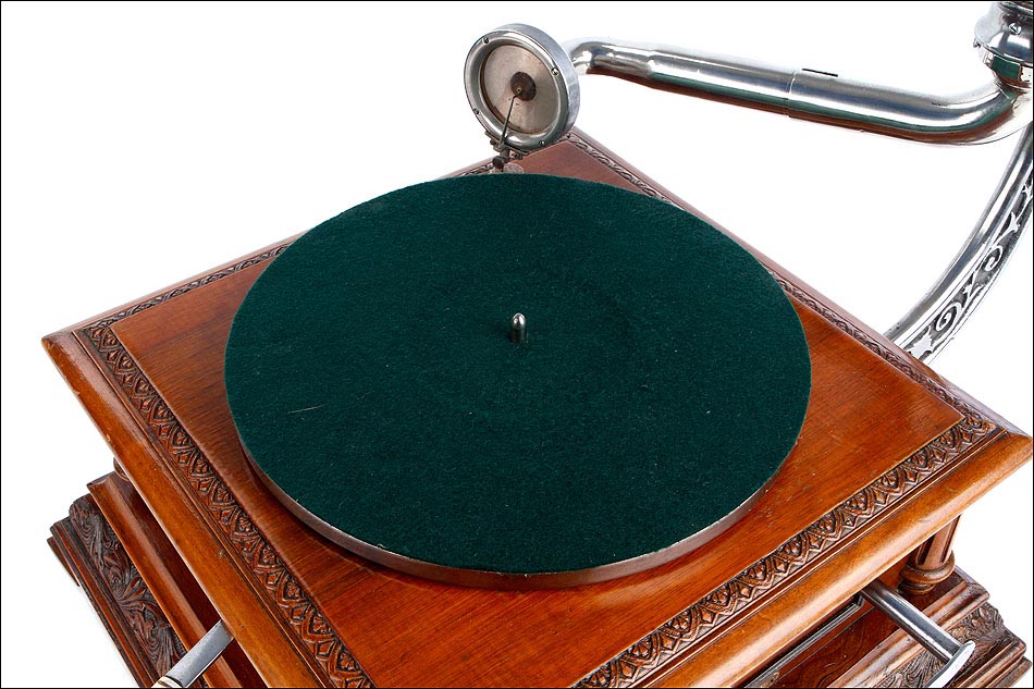 Este gramófono Pathé lleva uno de esos adaptadores y un reproductor de agujas de acero en perfectísimo estado. Ambos son de época y están en muy buen estado. Adicionalmente hemos calibrado el gramófono y le hemos bajado un poco su velocidad natural de forma que gire a 78 rpm en lugar de 100 rpm. Ahora mismo está adaptado para poder funcionar perfectamente con discos de gramófonos normales, de 78 rpm. Esto es una gran ventaja pues aún se pueden encontrar cientos de discos de gramófono en los mercadillos de toda España y los que más abundan son los discos de 78 rpm para poderlos tocar en esta gramófono. Los discos Pathé también se pueden encontrar, pero la proporción es de 50 a 1. Por cada disco Pathé que se encuentra, aparecen 50 discos de gramófono de 78 rpm.