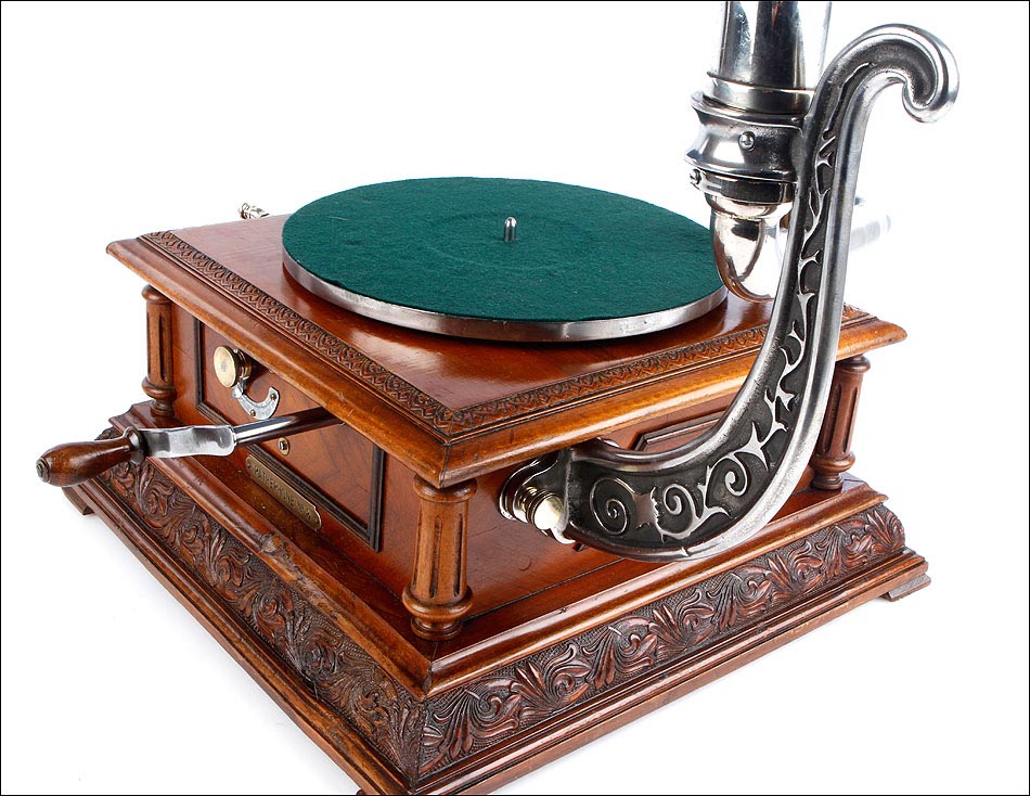 El adaptador del brazo para poder funcionar con reproductores de agujas de acero es original de época fabricado para máquinas Pathé. El reproductor es de la misma época. Hasta los tornillos traseros que ajustan el soporte del brazo con la caja de caoba, son originales de época. El motor dura de sobra para reproducir un disco grande de 30 cms. Los hay de 25 cms como el del vídeo y de 30 cms, de más larga duración. El freno funciona muy bien y queda muy ajustado.