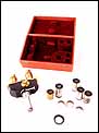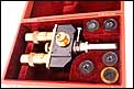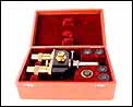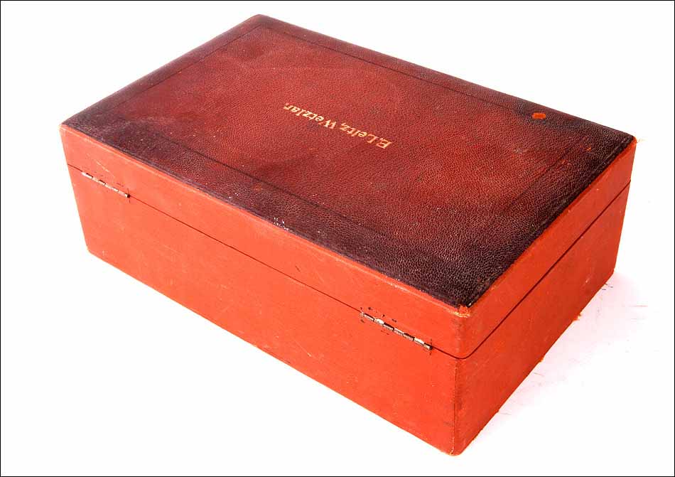 El conversor está fabricado en hierro fundido esmaltado en negro, latón dorado y metal plateado. El latón está en fantásticas condiciones, liso, pulido y brillante, mientras que el hierro esmaltado muestra una superficie lisa y regular. Sobre el esmalte negro podemos ver el nombre del fabricante, claramente grabado en letras minúsculas: Ernst Leitz Wetzlar. Por su parte, el estuche es muy atractivo: está forrado de piel color naranja por el exterior, con la tapa barnizada en un tono más oscuro. En la tapa aparece la firma del fabricante en letras doradas. El interior aparece revestido de terciopelo rojo y está compartimentado para poder guardar las distintas piezas del visor en perfecto orden.