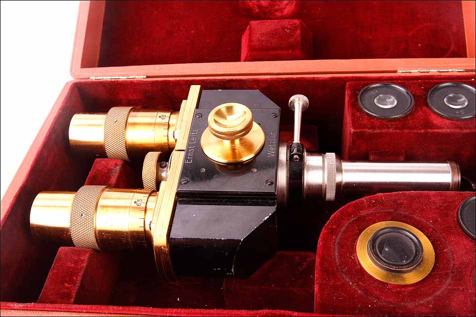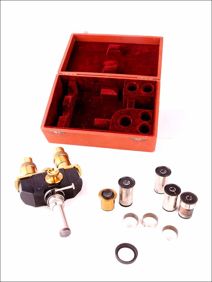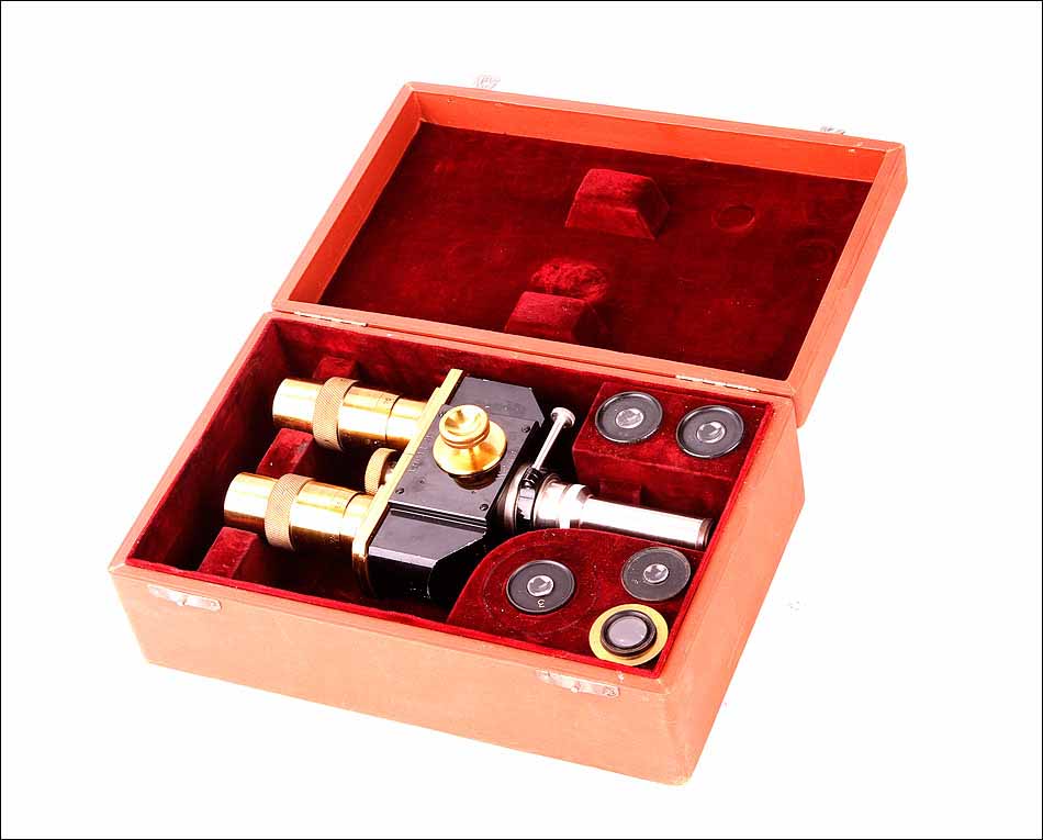 Magnífico visor estéreo firmado por Ernst Leitz Wetlzar y diseñado para transformar un microscopio monocular en binocular. El visor fue fabricado en Alemania a principios del siglo (1910-20) y se encuentra en muy buen estado de conservación. Todas sus piezas y componentes son originales de época y están en estado de uso, permitiendo utilizar el visor en un microscopio estandar. El artículo se presenta en su estuche original de época y va acompañado de un juego de oculares extra, en muy buenas condiciones. El estuche, además, está firmado por E. Leitz Wetlzar.