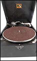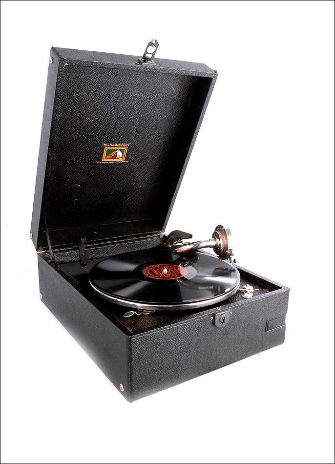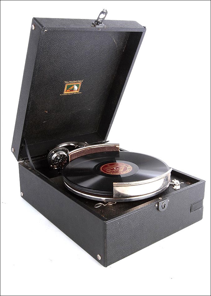 Antiguo gramófono de maleta His Master’s Voice (La Voz de Su Amo en España), fabricado en Gran Bretaña en el año 1935 y en muy buenas condiciones. El gramófono es el modelo 97-B, y entre sus singularidades destaca el accesorio para almacenar los discos que acompaña al aparato. El motor ha sido totalmente revisado y ajustado para garantizar un óptimo funcionamiento, por lo que en la actualidad el gramófono funciona perfectamente y reproduce discos antiguos con un sonido nítido y de calidad. La maleta forrada de piel negra y el resto de los componentes son totalmente originales, encontrándose también en muy buen estado de conservación.