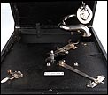 El revestimiento que recubre la maleta se muestra íntegro y bien conservado, sin partes rotas ni desgastadas. Tanto el asa como el cierre tipo maleta son originales y se encuentran en muy buenas condiciones. En el interior, el plato y los dispositivos que permiten poner el marcha el gramófono se asientan sobre una tabla pintada de negro que oculta el motor. Son de metal plateado y se muestran lisos, brillante y sin presencia de óxido. Lo mismo cabe decir del accesorio o soporte para almacenar los discos, una pieza de forma circular que se coloca sobre el plato y se retira para hacer funcionar el gramófono. El logotipo original, el nombre de la marca y el de la compañía fabricante aparecen claramente impresos en el interior de la tapa.