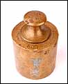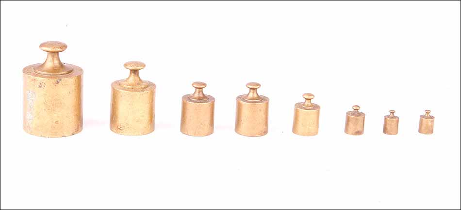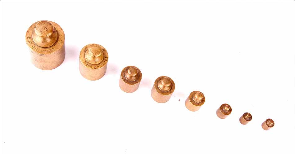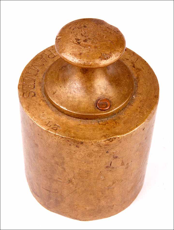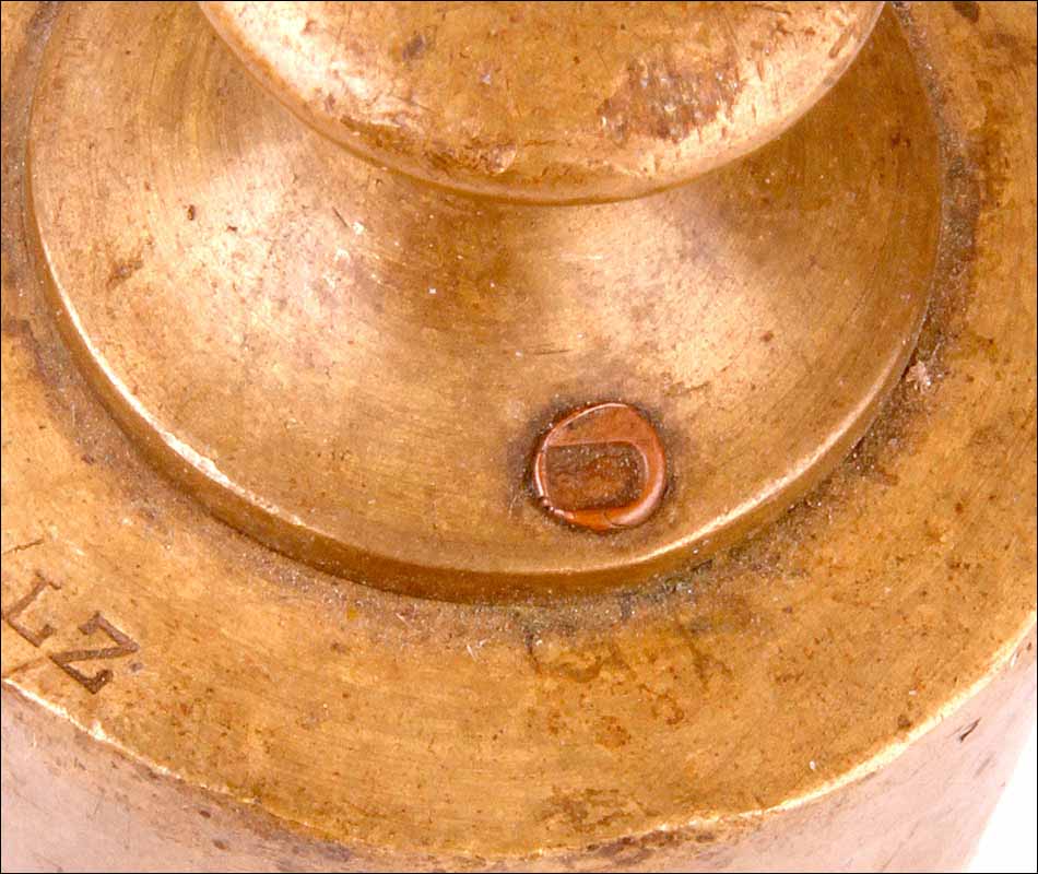 El cuerpo de la balanza es de hierro fundido, sólido y pesado. Está esmaltado en negro mate: el acabado se muestra en buenas condiciones, sin apenas signos de desgaste. El logotipo dorado está magníficamente conservado, completo y totalmente legible. Las piezas de latón dorado (engranajes y cuenco-platillo) también están en muy buen estado, sin rastros de óxido o deterioro. En cuanto al juego de pesas de bronce, está formado por ocho piezas y se conservan todas, incluso las más pequeñas. En su parte superior podemos ver grabado el peso de cada una de las piezas, junto con el sello de la inspección.