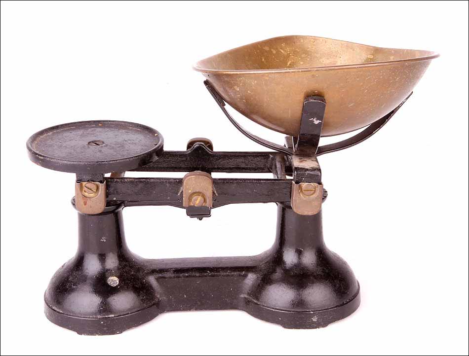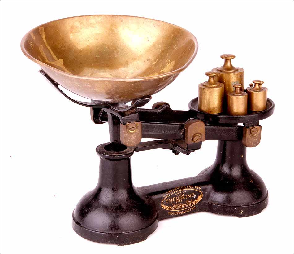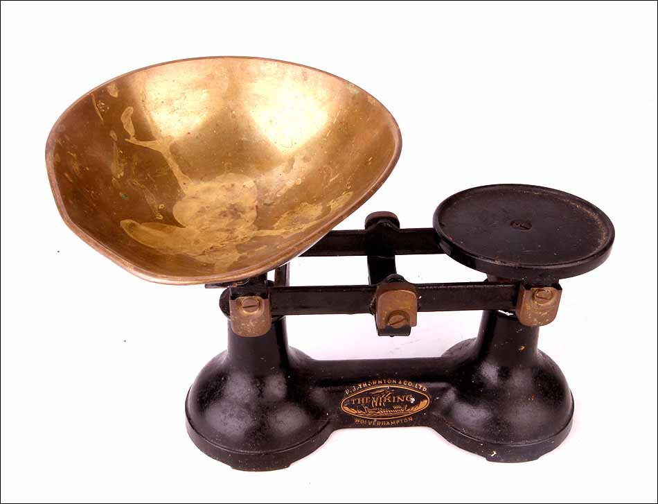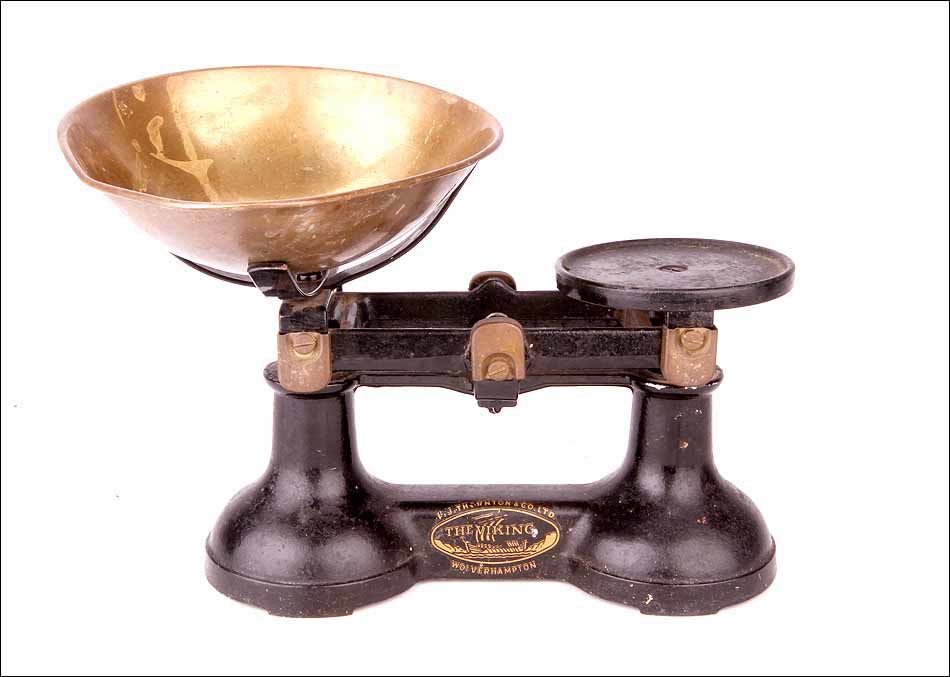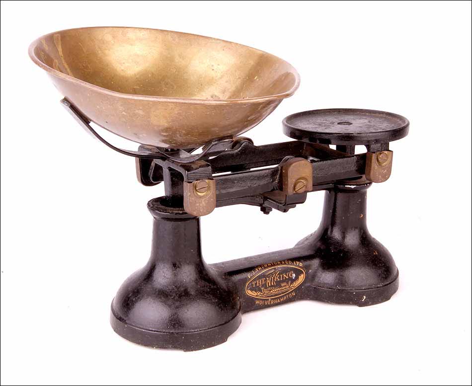 Preciosa y sólida balanza fabricada en Inglaterra en los años 20 del siglo XX. La balanza es de la marca “The Viking” y fue fabricada por la empresa de básculas y pesos F. J. Thornton & Co. Ltd. Está magníficamente conservada y va acompañada de un juego de pesas de bronce, completo y en muy buenas condiciones. Probablemente se trate de una balanza de comercio: el juego de pesas conserva las marcas que dejaban los inspectores tras verificar que su peso era correcto, y que no habían sido manipuladas. Tanto la balanza como las pesas conforman un conjunto muy atractivo: el equilibrado diseño de la máquina y su atractiva combinación de colores y materiales llaman poderosamente la atención.