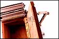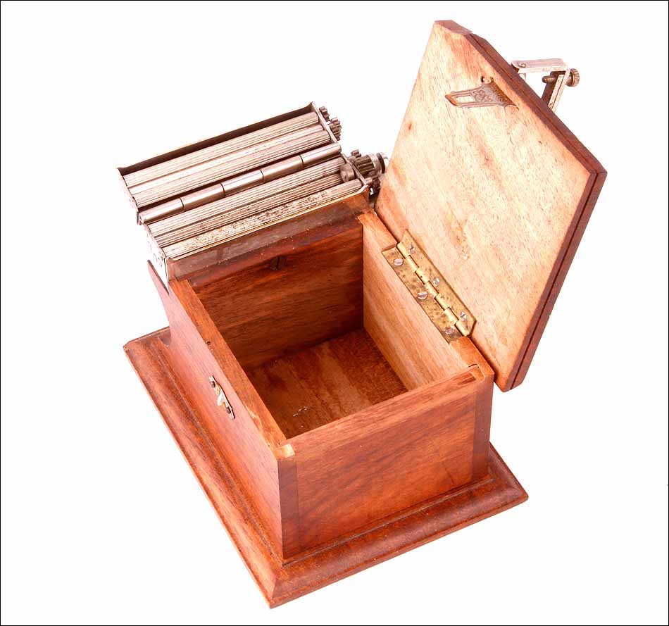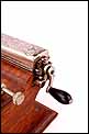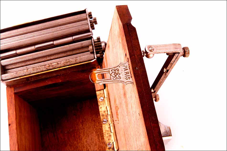 La máquina que vemos en las imágenes es un modelo de lujo. Se trata de una ‘Machine du Siecle’ (máquina del siglo), con caja de madera de caoba maciza y piezas móviles de metal cromado. La madera de caoba muestra un excelente estado de conservación, sin golpes ni arañazos y con un intenso color entre rojizo y dorado. La caja está hueca: en su interior hay un compartimento para guardar el tabaco y el librillo de papel, a la cual podemos acceder levantando la parte superior gracias a la bisagra que conecta ambas piezas. El cierre que las ajusta e impide que la caja se abra es de metal y lleva la palabra PARIS grabada, acompañada de un motivo decorativo esquemático.