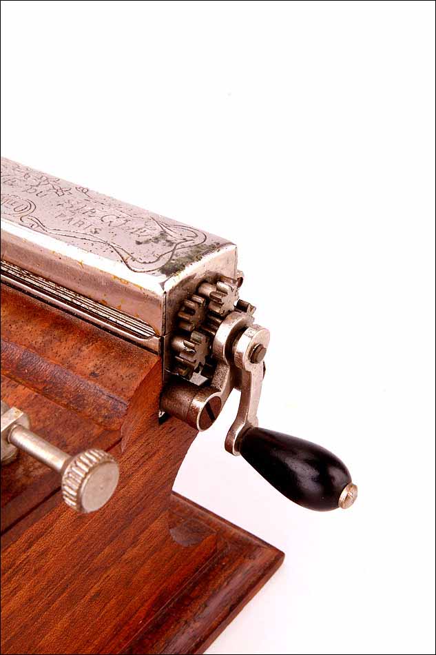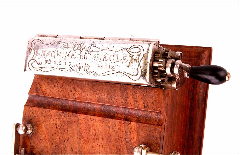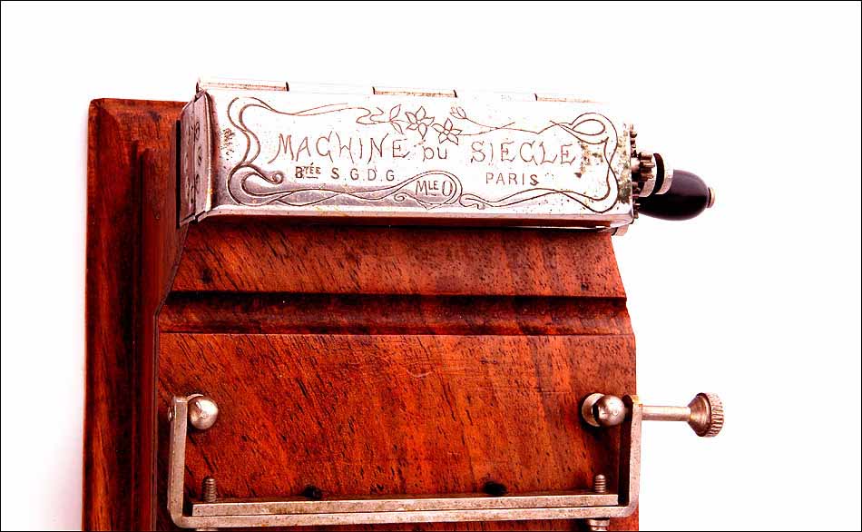 En la parte superior de la máquina encontramos dos piezas de metal en ángulo, entre las que se coloca el papel. Frente a ellas se sitúa la pieza móvil con la esponjilla, y en la parte posterior, una caja de metal con una manivela y rodillo. Este sistema es el que fabrica el cigarrillo, tras depositar sobre el papel la cantidad de tabaco adecuada. La tapa de la caja de metal lleva grabada la inscripción MACHINE DU SIECLE –BVTE. SDGD (sans garanti du gouvernement), junto con un delicado y sencillo motivo grabado a mano: tres flores de largos tallos.